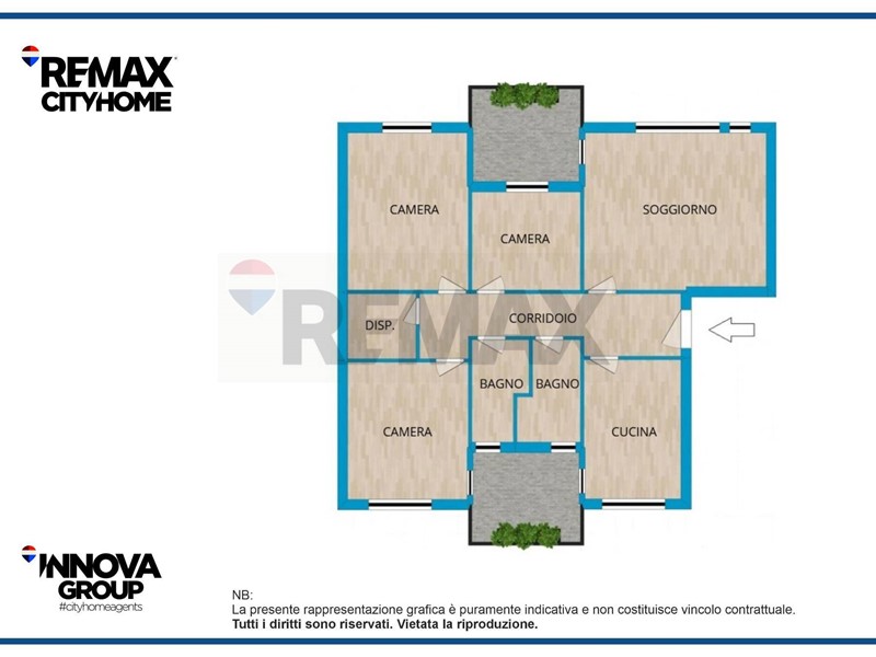 La disposizione degli spazi prevede 5 locali, di cui 3 camere da letto, un salone, una cucina abitabile, 2 bagni ed un piccolo ripostiglio.