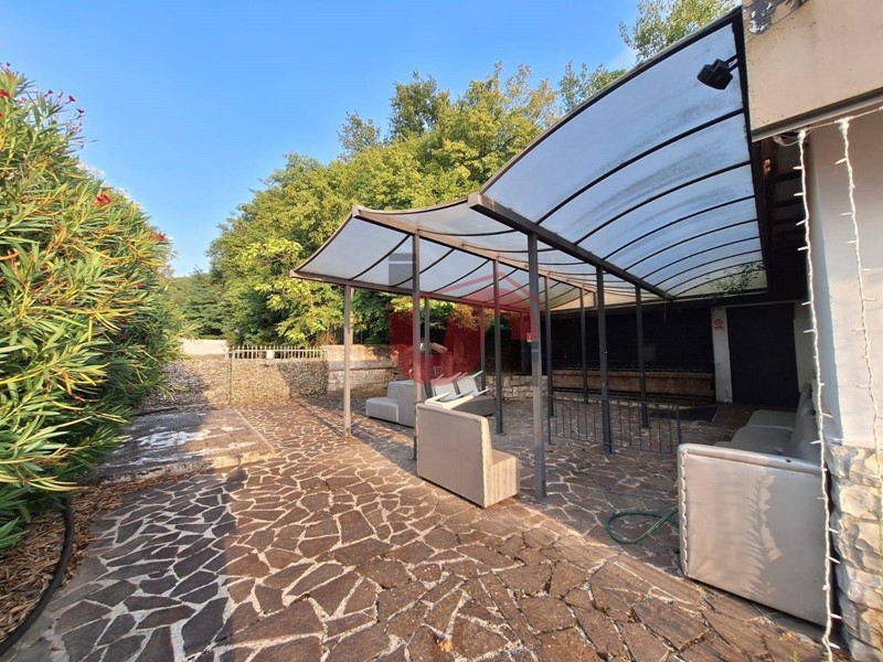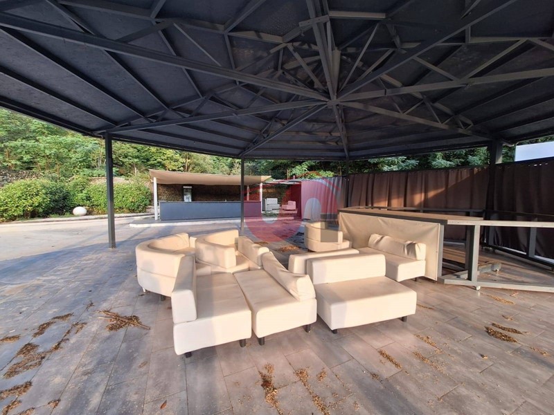 In posizione sopraelevata rispetto all'accesso e raggiungibile tramite un suggestivo viale, si sviluppa una area scoperta dotata in parte di tettoia in legno ottima per eventi, serate di ogni tipo e momenti di aggregazione. Questa area gode anche di una postazione bancone e di servizi.