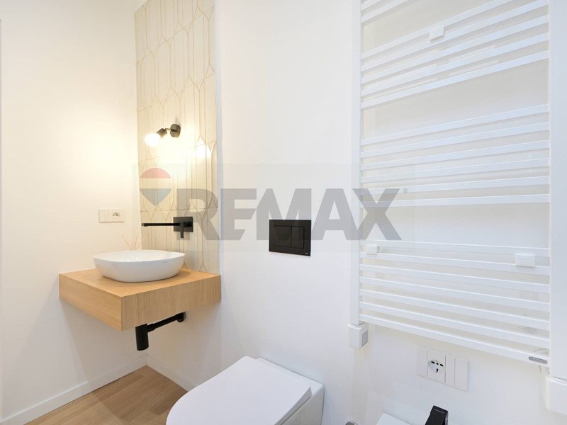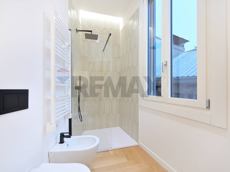 Lingresso accoglie con un pratico guardaroba su misura e laccesso al ripostiglio in quota. La zona giorno, particolarmente luminosa e affacciata sul silenzioso interno, gode di tre ampie aperture che conducono al balcone. La cucina a vista con zona pranzo crea un ambiente conviviale, ideale per vivere e intrattenere. Un disimpegno conduce al primo bagno completo, rifinito con materiali di alto livello, e alla colonna lavanderia integrata. La spaziosa camera matrimoniale ospita un grande armadio a parete e dispone di un bagno en suite finestrato, completo di ampia doccia walk-in e illuminazione scenografica a led. Grazie alla pianta flessibile, è possibile ricavare un piccolo trilocale. Lintero appartamento è stato oggetto di una ristrutturazione integrale: impianti elettrico e idraulico nuovi, parquet in rovere chiaro posato a spina di pesce, controsoffitti con faretti incassati e dettagli decorativi.