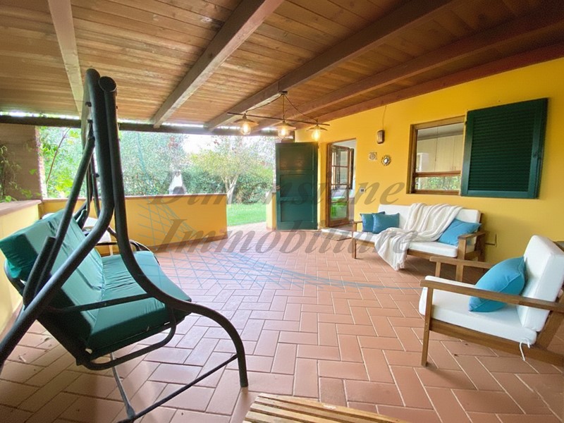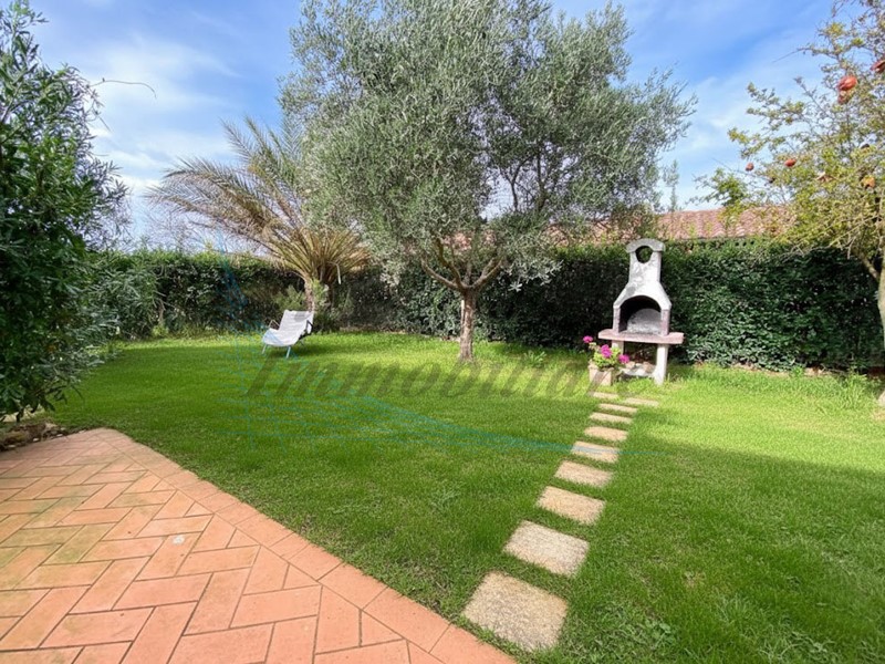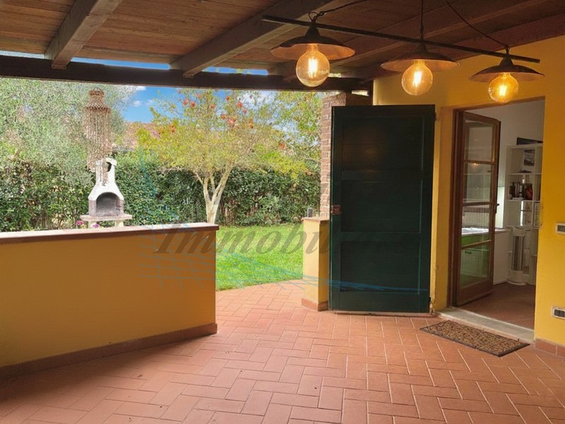 All’esterno, un porticato pavimentato di circa 20mq. sempre ombreggiato, circondato da un giardino angolare di 150mq. con area barbecue, che abbraccia l’abitazione e conduce direttamente alla piscina del residence.