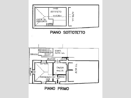 in Frazione Concentrico, all'interno di fabbricato libero da tre lati, due piani f.t. oltre a sottotetto e cantina al piano interr., con aree esterne in parte a giardino ed in parte a cortile/passaggio e posti auto: alloggio al piano 1 con accesso tramite scala esterna esclusiva, composto da soggiorno con tetto in vista con soppalco non abitabile(ex locale sottotetto),angolo cottura, disimpegno, bagno, camera e ampio balcone con piccolo terrazzino d'angolo, più proprietà esclusiva di area esterna al piano terreno oltre posto auto