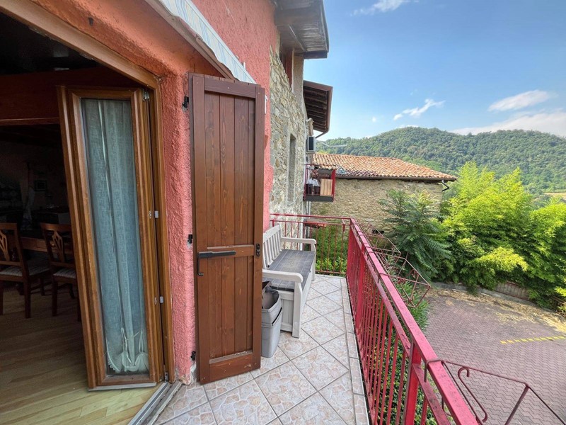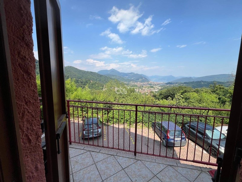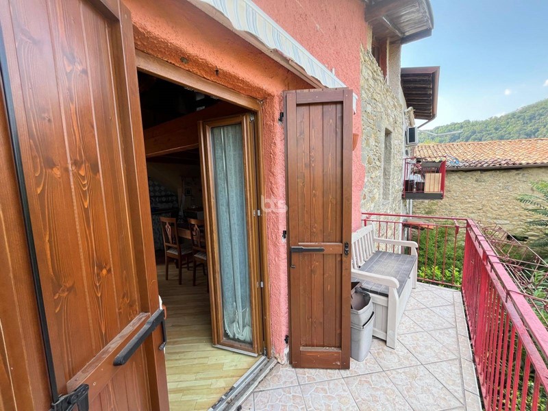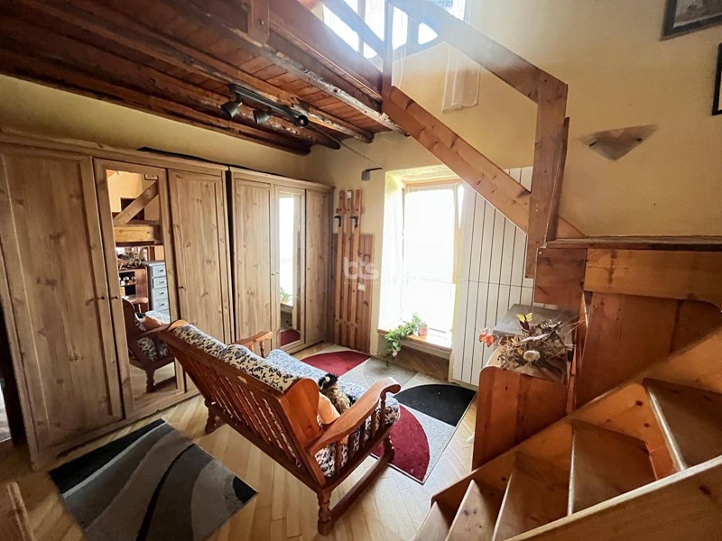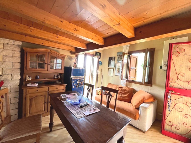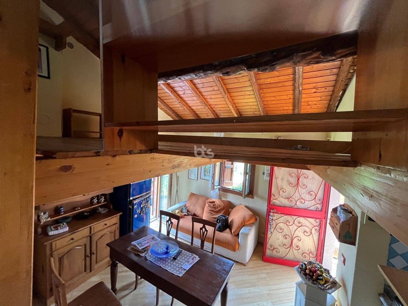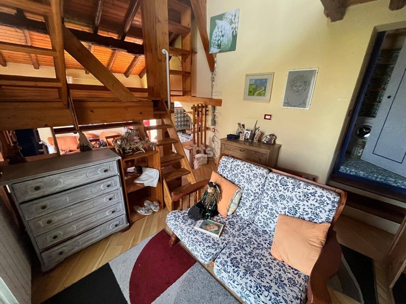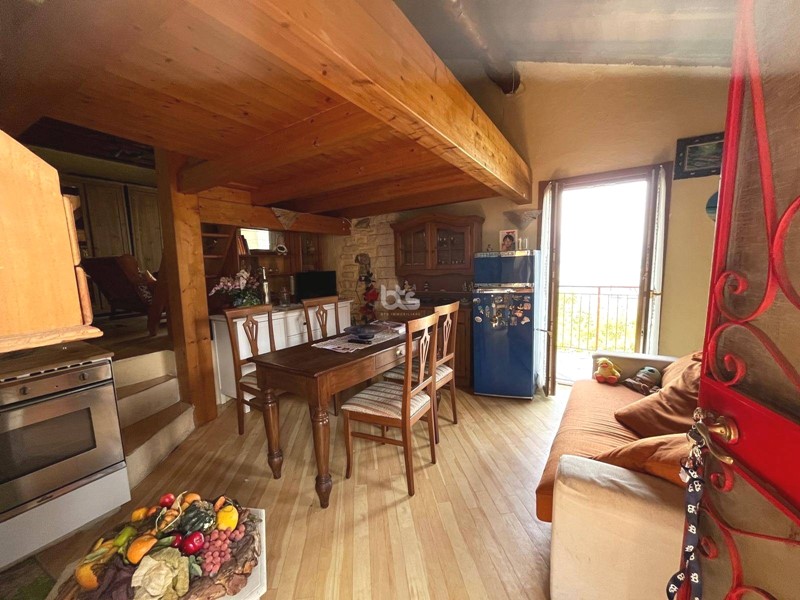 Lingresso si apre su una luminosa zona open space con angolo cottura e soggiorno, con accesso al magnifico balcone con vista panoramica, caratterizzata da finiture calde e accoglienti, grazie al pavimento in legno e al tetto con travi a vista recentemente rifatto.