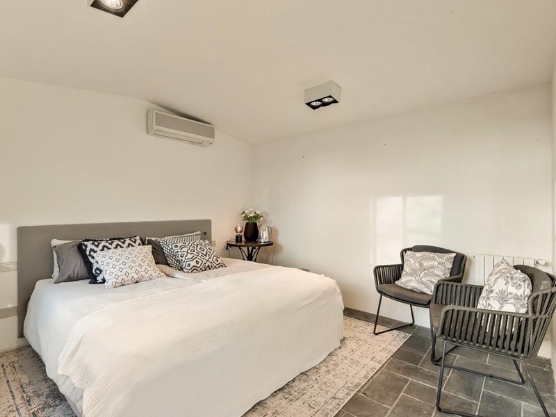 La zona notte al primo piano accoglie la suite padronale con bagno en suite e cabina armadi, insieme a due ampie camere matrimoniali servite da un ulteriore bagno. Una delle camere gode di accesso indipendente, garantendo privacy e flessibilità agli ospiti. Questo livello ospita anche uno spazio che disimpegna le camere e corredato da un angolo lettura/ufficio per smart working.