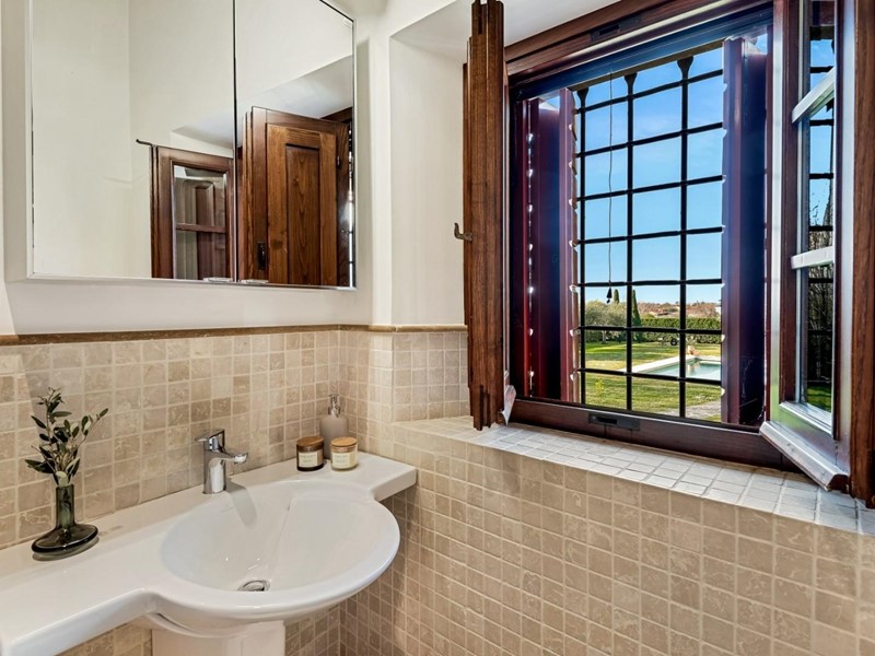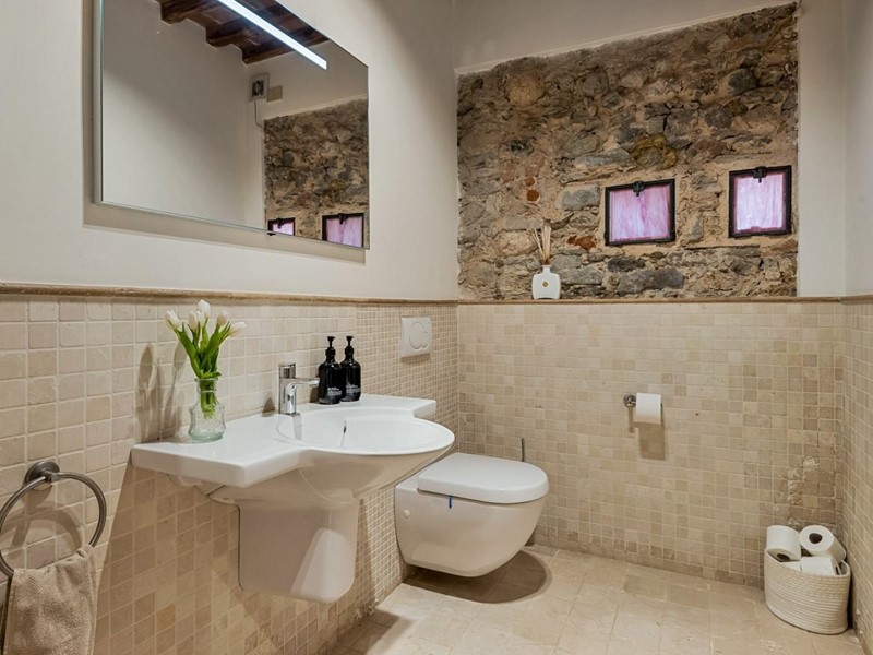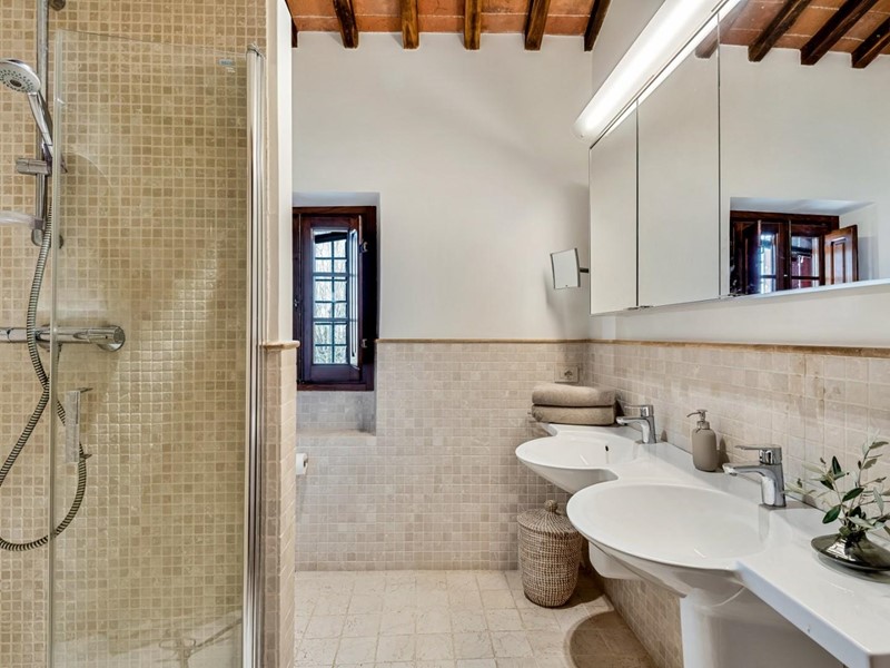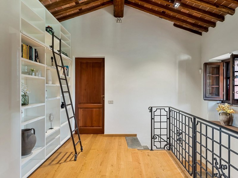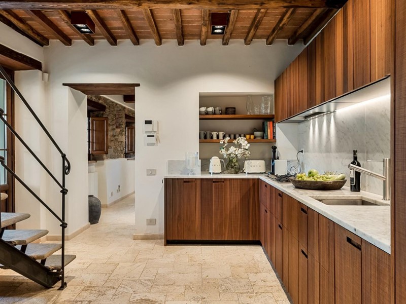 Al piano terra del casale principale, l'ingresso si apre su una moderna cucina a vista collegata ad un grande e accogliente salone impreziosito dal maestoso camino in pietra e perfetto per i momenti conviviali. La veranda esterna offre uno scenario incantevole per pranzi e cene all'aperto, con vista sulla piscina ed il verde circostante. Sempre a questo livello si unisce alla cucina il soggiorno ed un primo bagno di servizio.