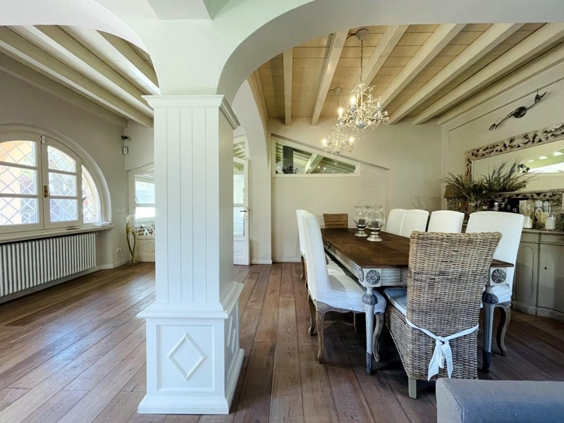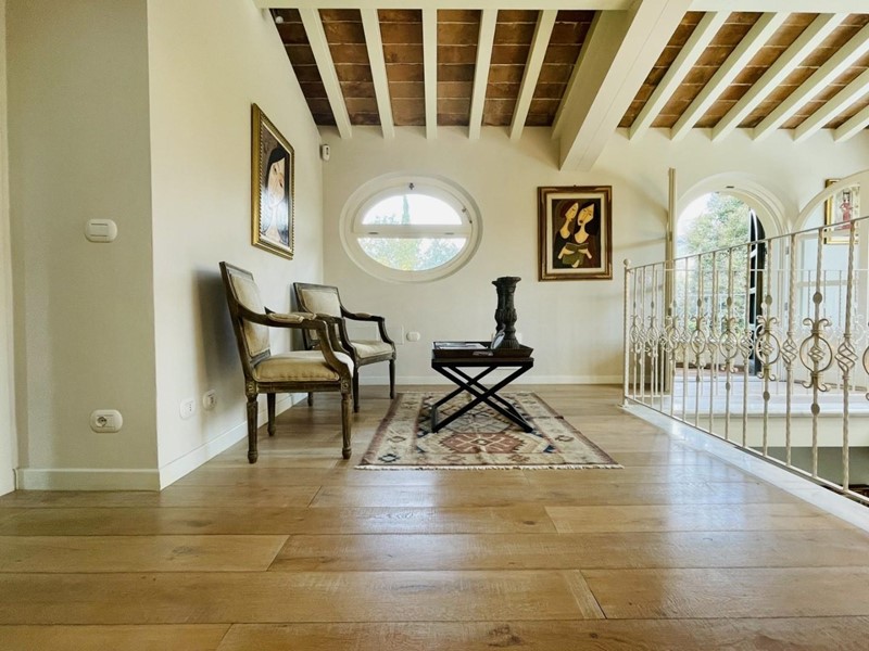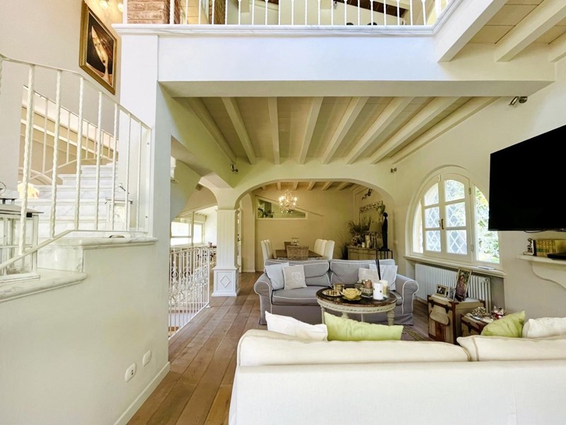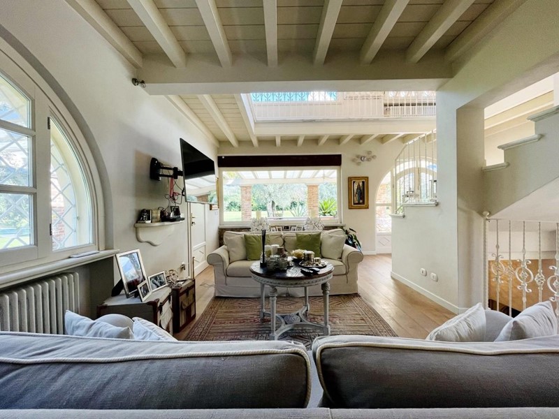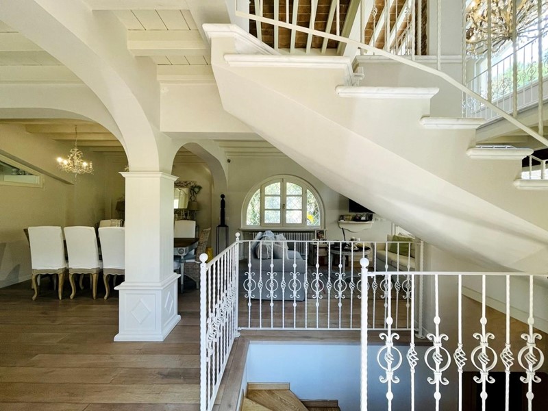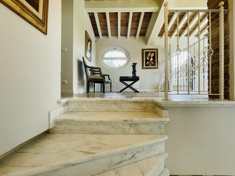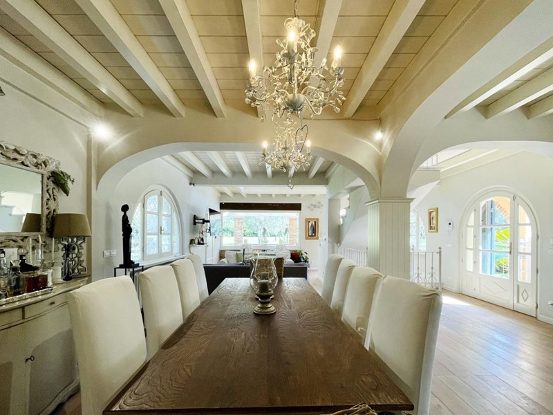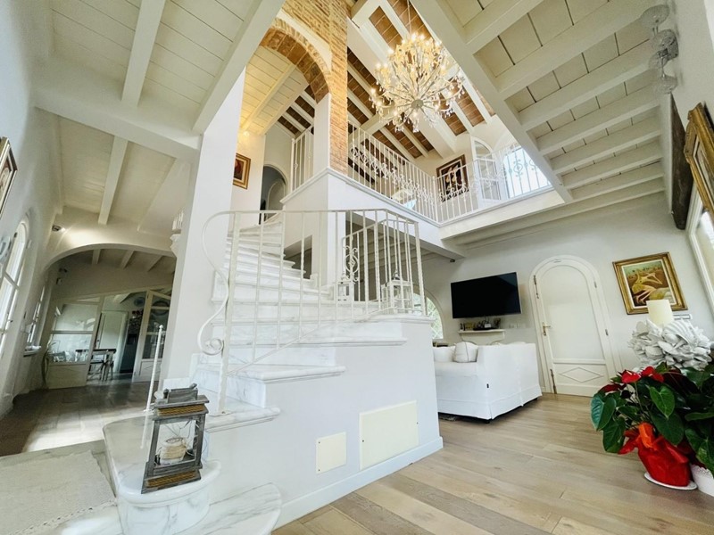 Gli spazi sono impreziositi da archi e colonne, boiserie e decorazioni di gusto, oltre alle innumerevoli vetrage che circondano il perimetro dell'abitazione donando luminosità ed un'eleganza senza tempo.