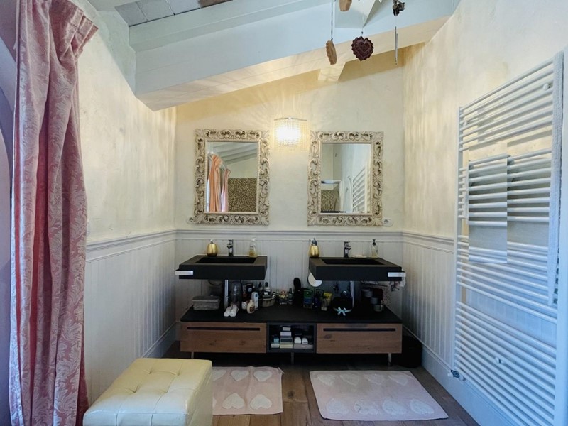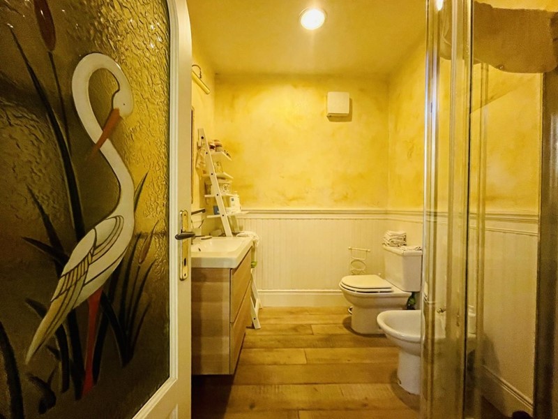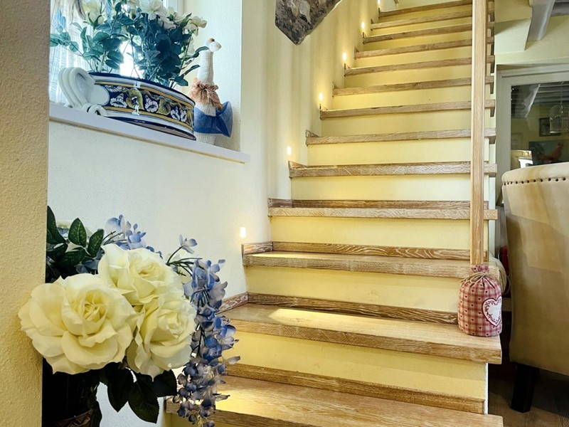 Nelle pertinenze della dimora principale troviamo la seconda abitazione che presenta caratteristiche ancora più tradizionali, la facciata in sasso e l'arredamento in stile provenzale. L'ingresso avviene al piano terra nel salotto con divani, camino e TV. Attraverso la porta a scrigno rifinita pregevolmente si giunge nella cucina abitabile con dispensa. Conlude la descrizione di questo piano una camera matrimoniale (2 pax) ed un bagno con box doccia.