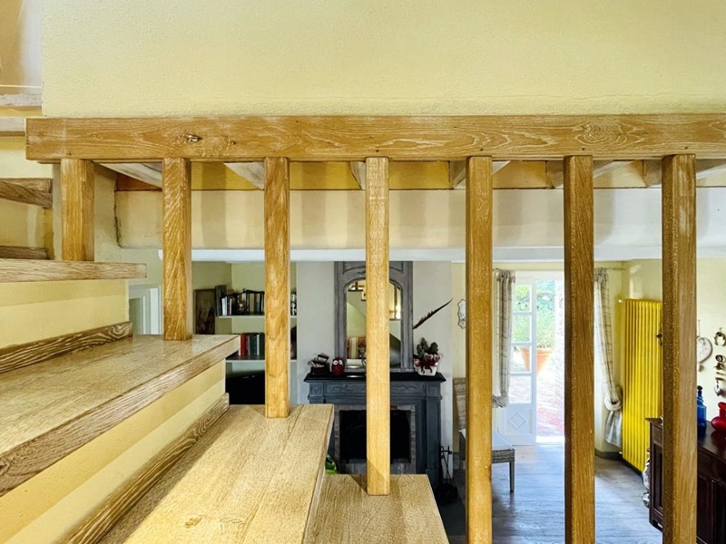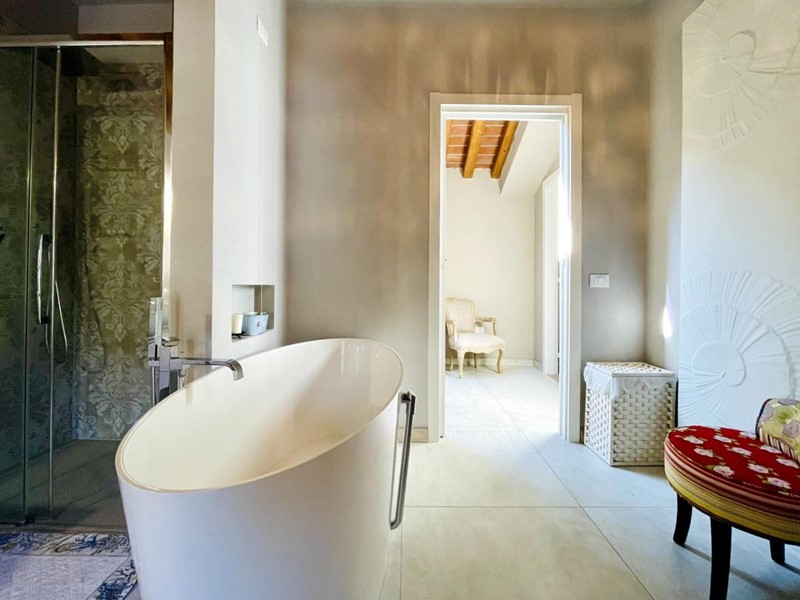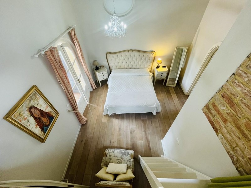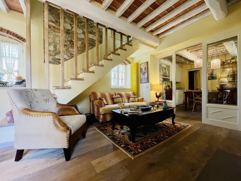 Il piano primo è reso suggestivo dall'affaccio sulla sala al piano terreno che crea una doppia altezza arricchita dal lampadario in cristallo e dalle ampie aperture con vista sulle Alpi Apuane. Questo piacevole angolo rilassante è servito da due poltrone di design, attraverso la porta finestra si accede alla terrazza, da qui si gode della pace che suscita l'atmosfera di campagna.
