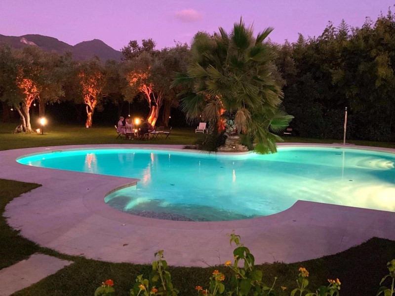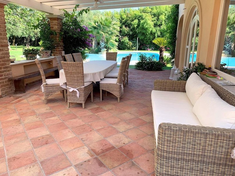 Esternamente la proprietà è contornata dal verdeggiante e rigoglioso parco di 6000mq, ospitante erbe ed arbusti locali. La piscina, posta nella parte centrale del lotto e finemente rifinita completa la proprietà rendendola una vera e propria residenza di lusso dal sapore unico.