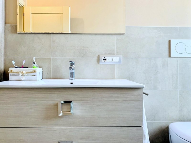 La zona living si compone di un luminoso soggiorno con sala da pranzo e salotto con TV. Sempre a questo livello si trova un vano attualmente occupato da un divano-letto (1 pax), una comoda lavanderia ed un bagno con box doccia.