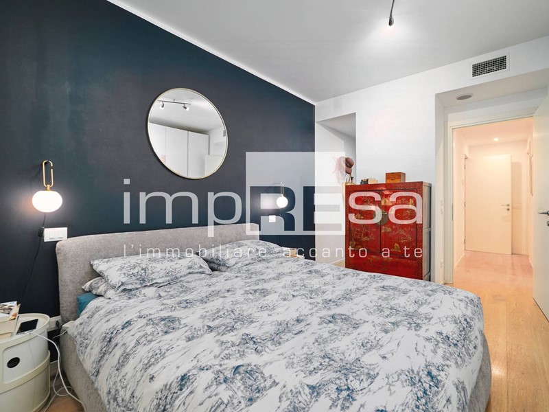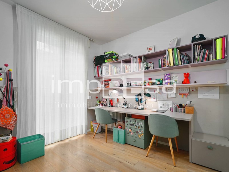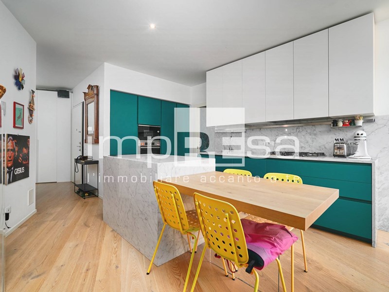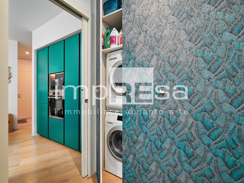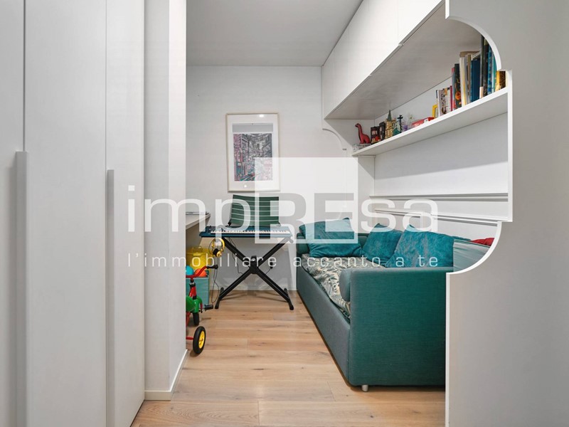 Zona giorno: ampio ingresso che conduce sulla sinistra alla cucina su misura con isola in marmo ed ampia finestra e terrazzino vista fiume; dalla cucina si accede alla prima camera finestrata, attualmente adibita ad uso studio con angolo lavanderia chiuso da armadiatura su misura.