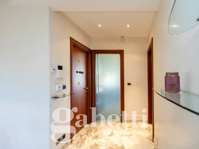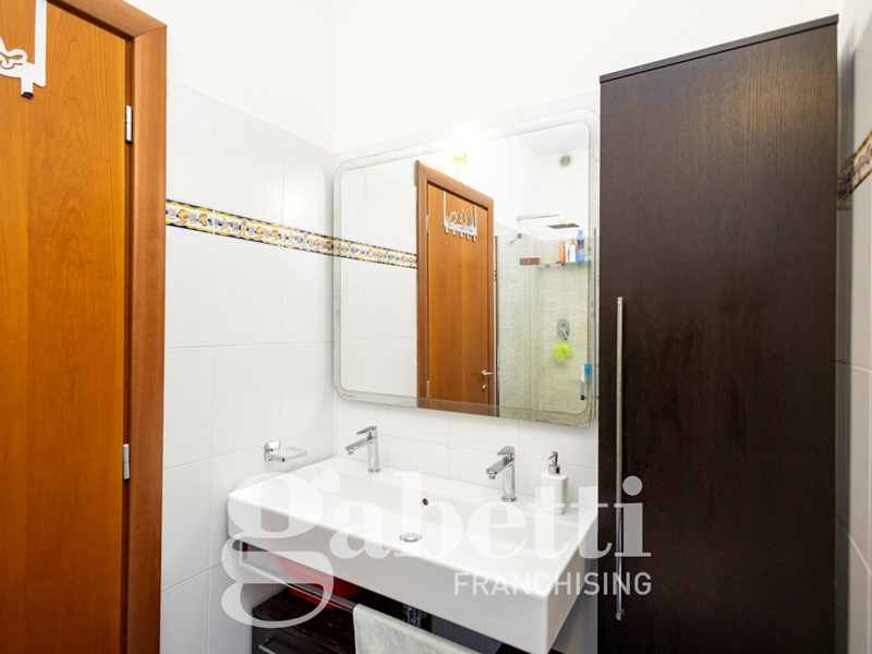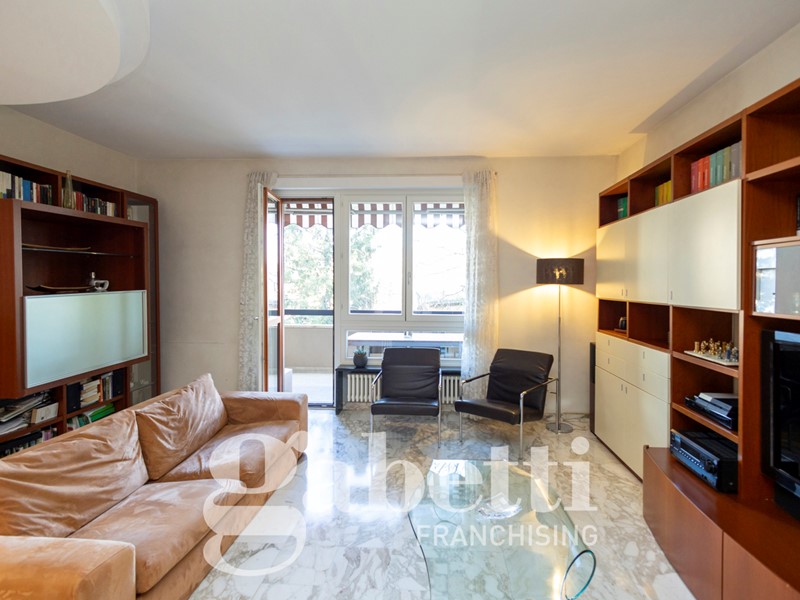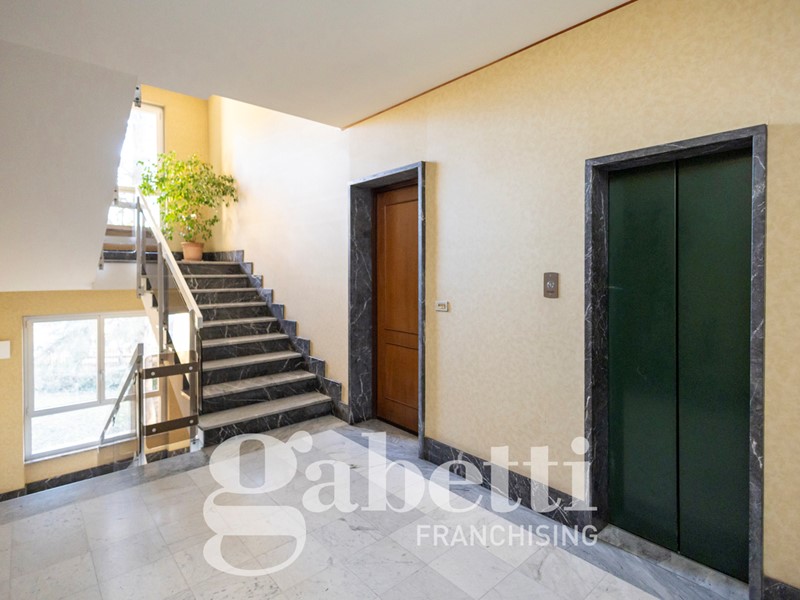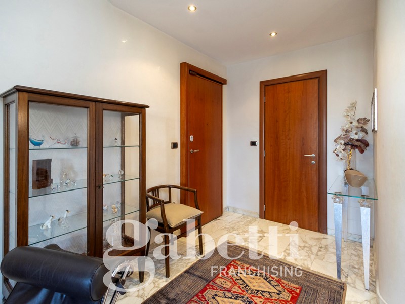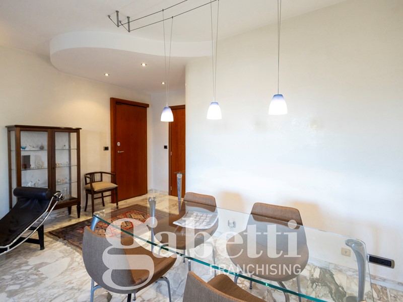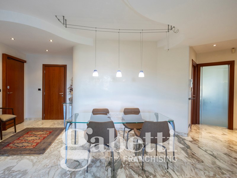 L'alloggio è internamente così composto: ingresso sull'ampio salone, cucina abitabile, quattro camere (di cui una adibita a studio), due bagni (di cui uno cieco), ripostiglio, oltre al terzo bagno adibito a lavanderia e bagno per ospiti. Due balconi profondi.
