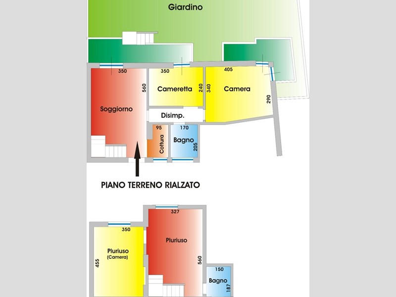 L'immobile, sviluppato su due livelli, offre un'ottima e razionale suddivisione degli spazi: al piano terreno rialzato di circa 60 mq. troviamo un soggiorno accogliente con uscita su un balcone che affaccia sul giardino, cucinotto separato, disimpegno che conduce alla zona notte, camera media con vista sul giardino, camera matrimoniale con balcone anch'esso affacciato sul giardino e bagno finestrato.