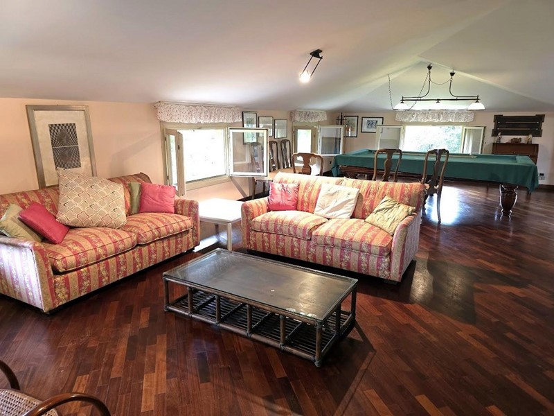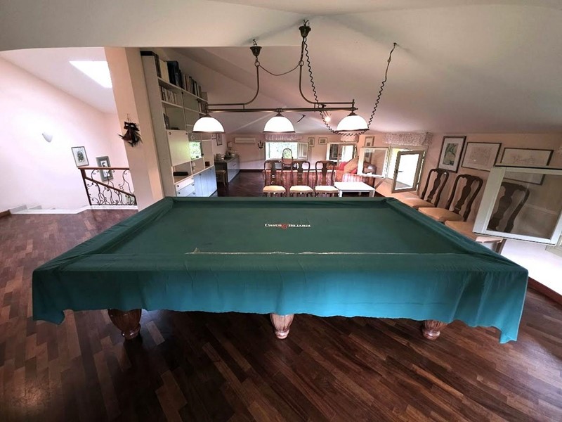 Ampio spazio abitabile comune con tavolo da biliardo e salotto, perfetto per il relax o come studio creativo.