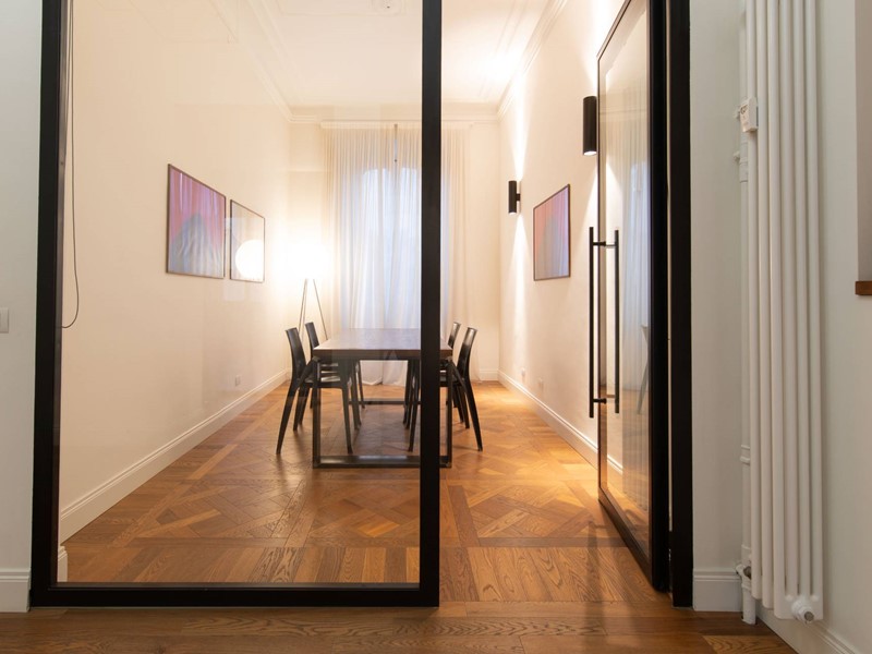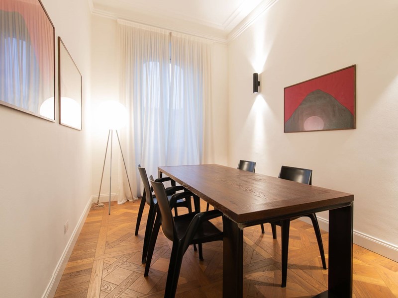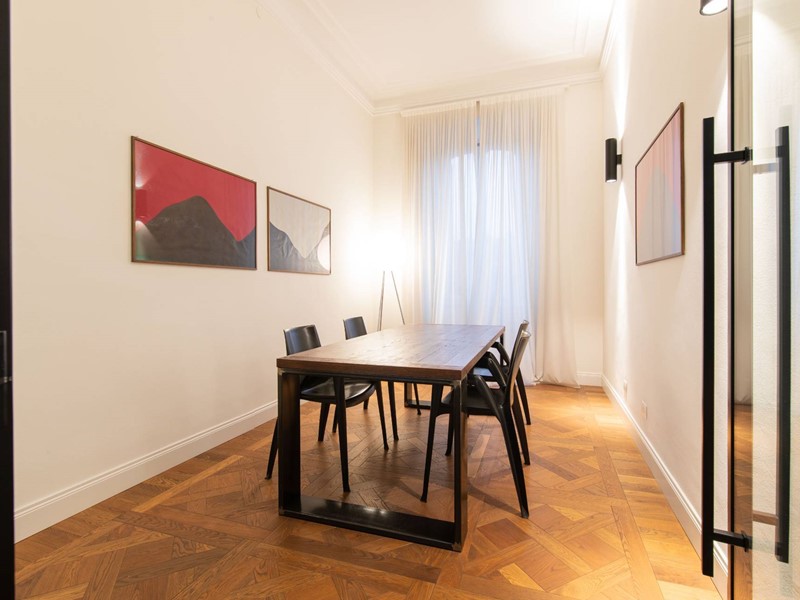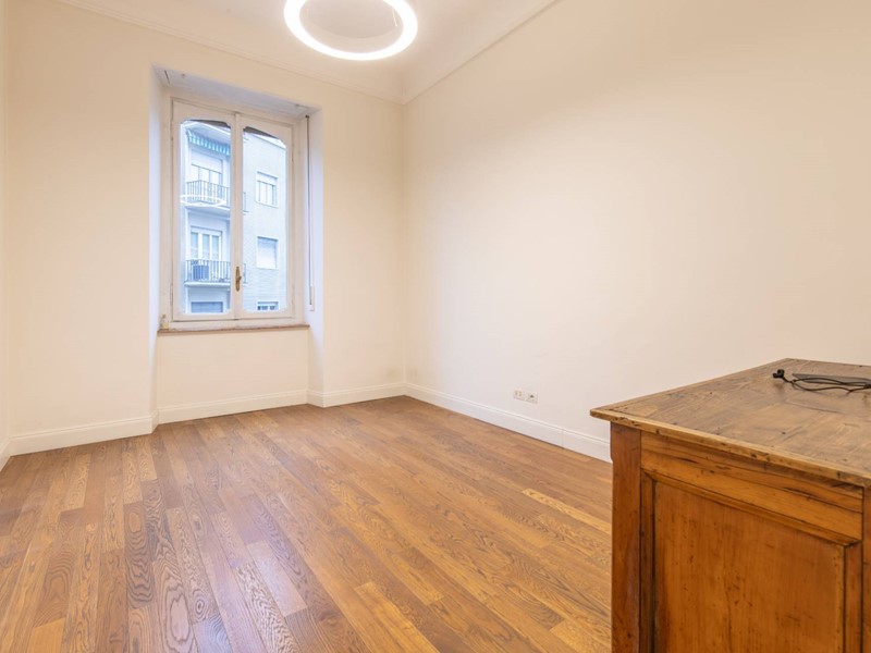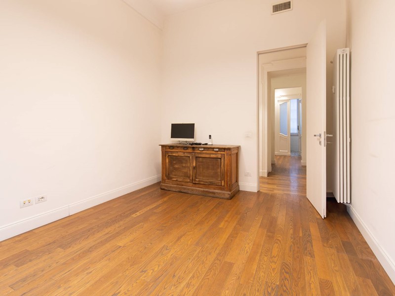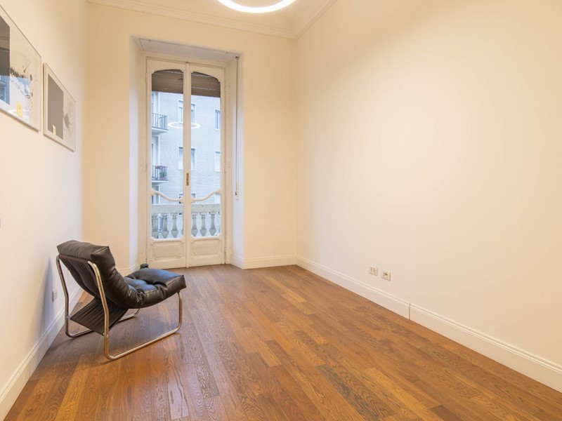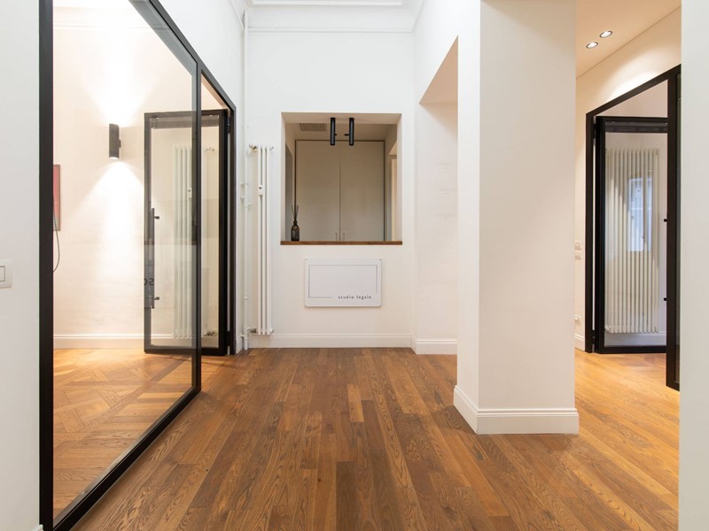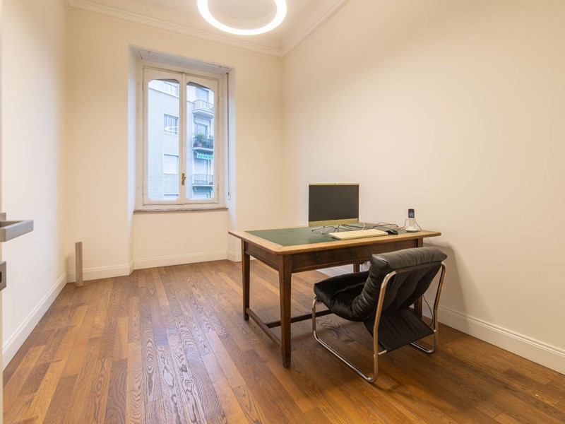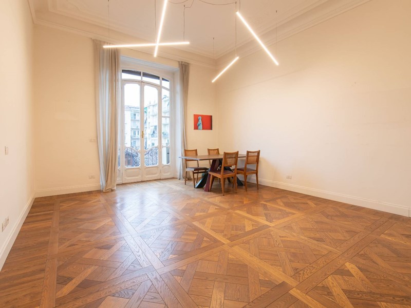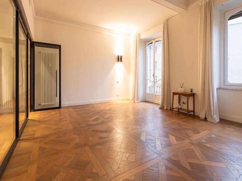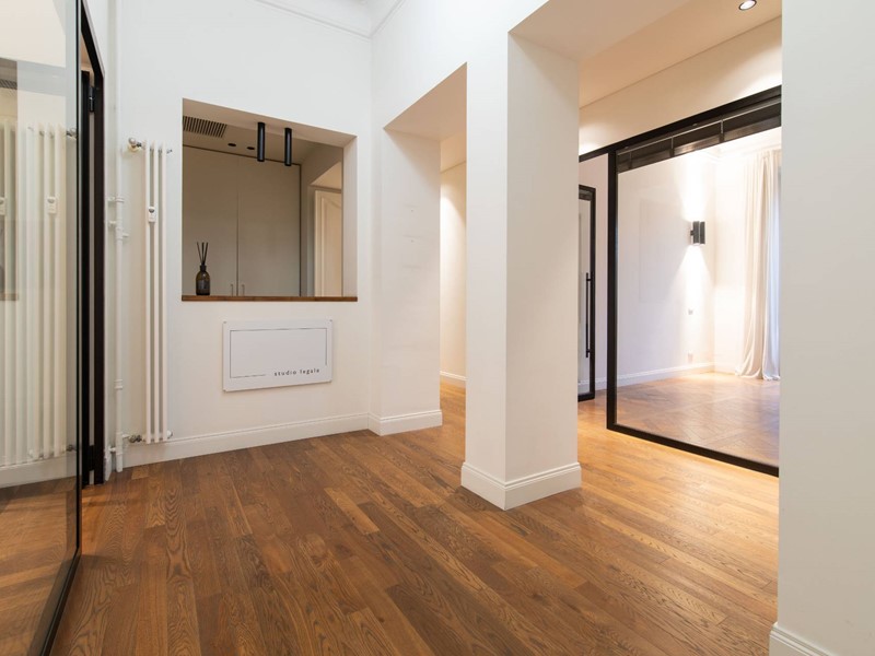 L'appartamento è caratterizzato da finiture di pregio come il parquet in pregiato legno massello disegnato su misura in tutti gli ambienti, impianto di condizionamento canalizzato