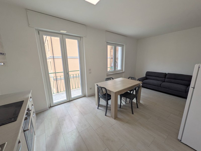 Zona giorno openspace con angolo cottura e piano a induzione, servita da balcone
