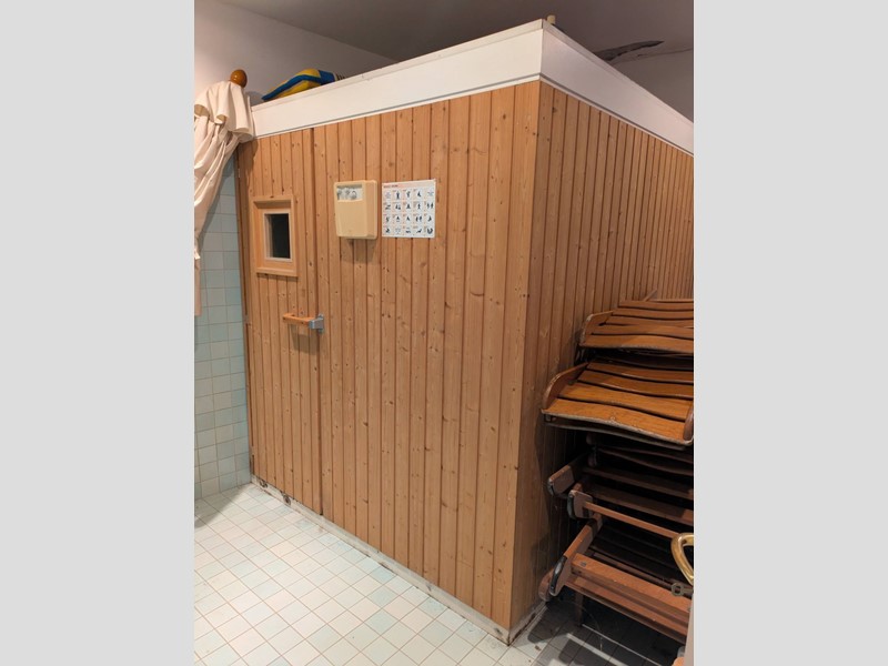 Una zona piscina rialzata domina il parco, completa di tettoia con area pranzo estiva e banco bar, oltre a spogliatoi e sauna sottostanti.