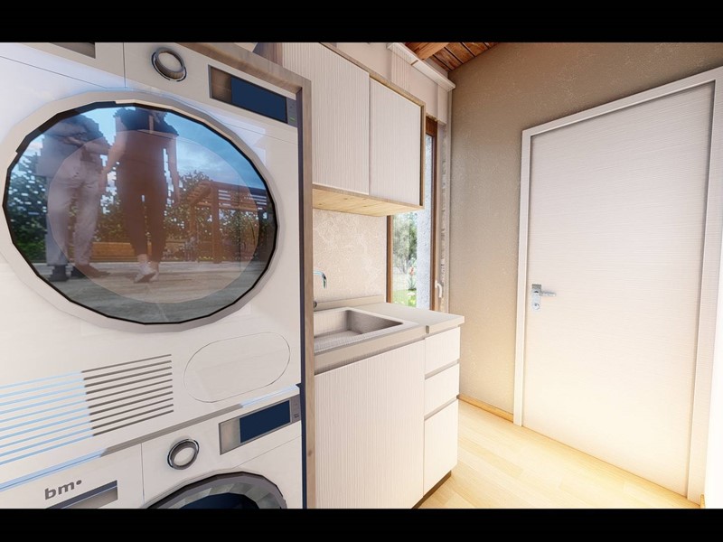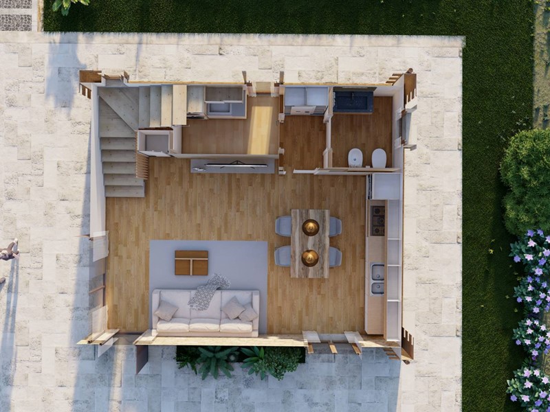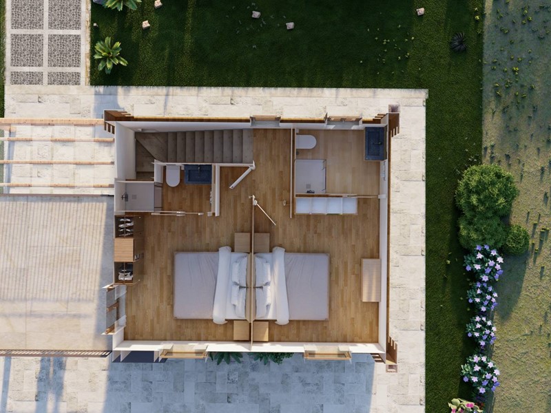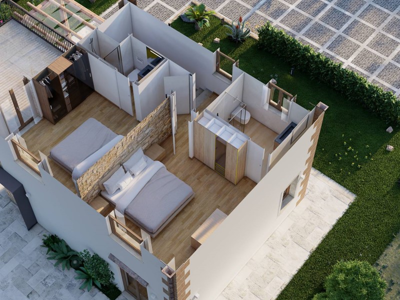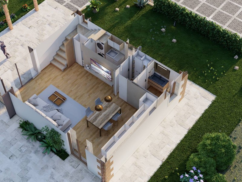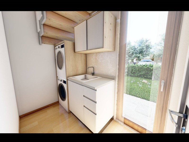 Le ville presentano al piano terra ingresso su ampia zona living con angolo cottura e accesso in veranda, disimpegno, bagno, lavanderia e scala a giorno che conduce al piano superiore dove si sviluppa la zona notte, composta da disimpegno, due camere da letto con bagno in camera, di cui una con accesso su veranda.