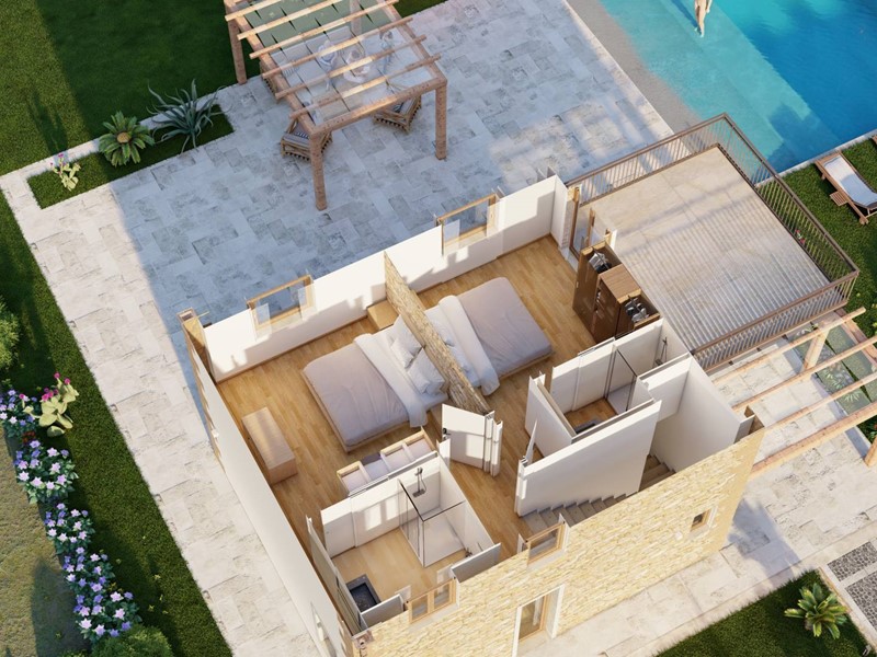 Ogni villa dispone di una piscina a sale con spiaggetta, solarium e ampi spazi esterni. Ottima soluzione per trascorrere in totale relax, privacy e comfort le proprie giornate in un ambiente suggestivo ed esclusivo.