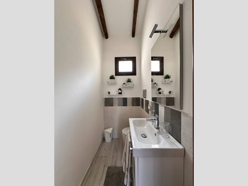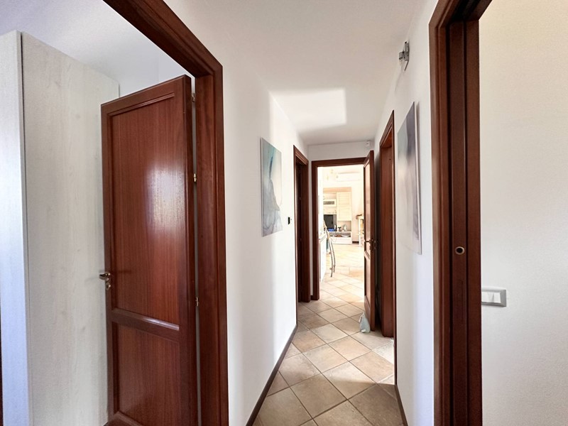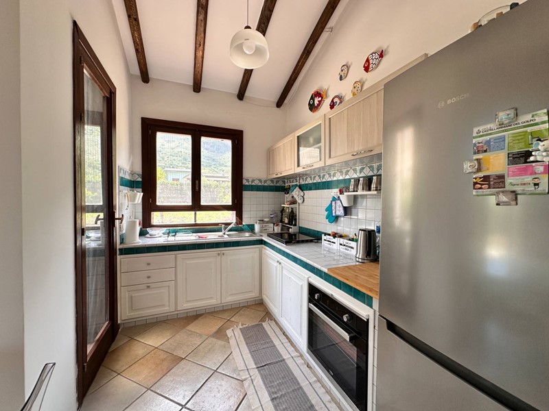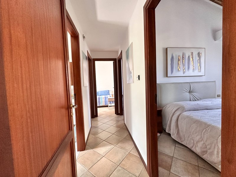 L'ingresso si apre su un luminoso salone con camino, adiacente a una cucina in muratura. La zona notte comprende due camere da letto, una cameretta e due bagni, di cui uno con doccia.