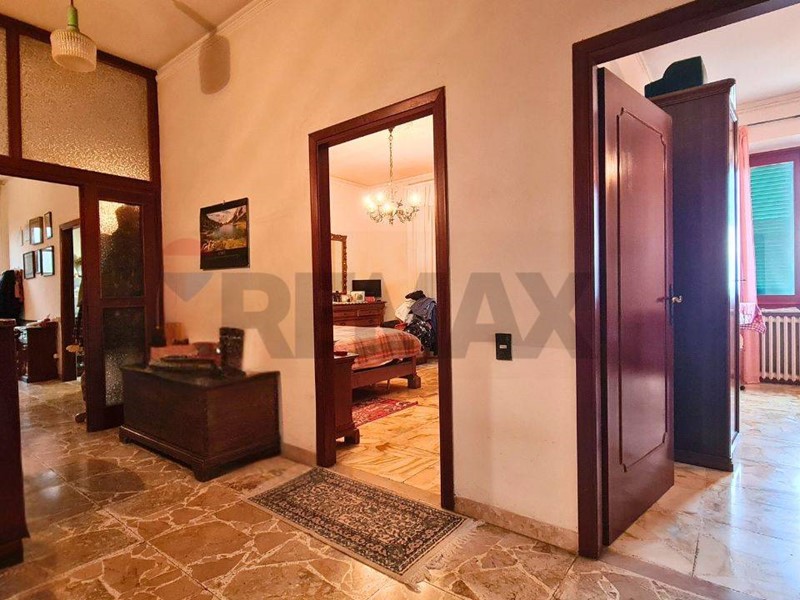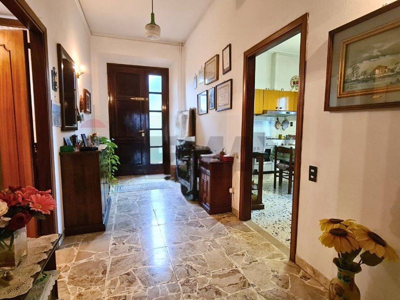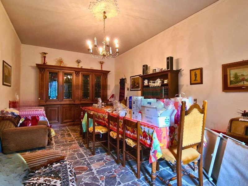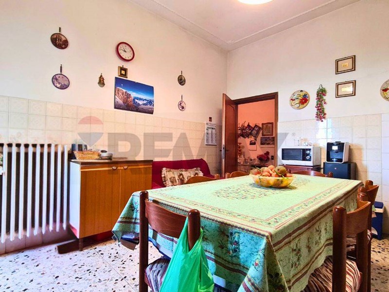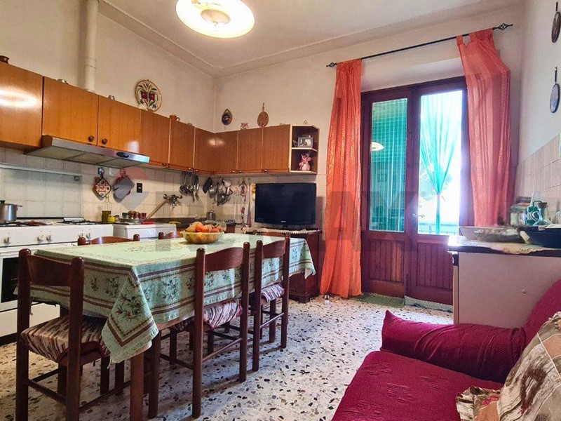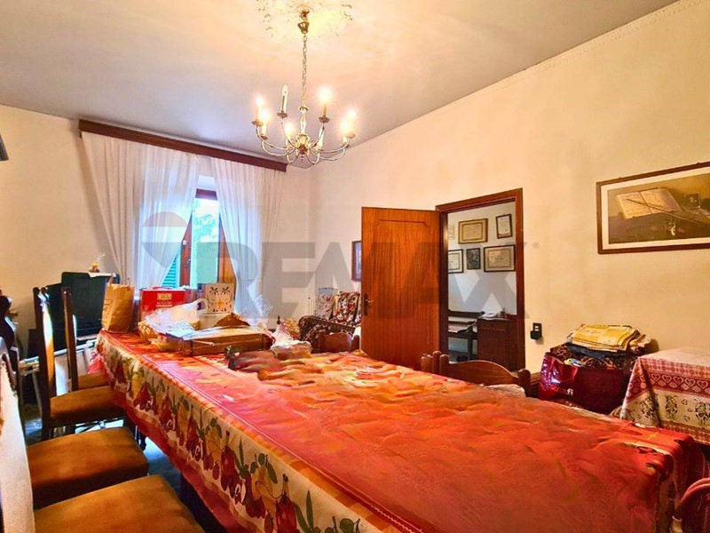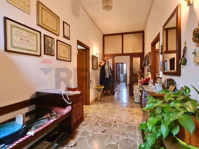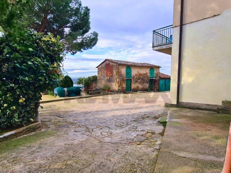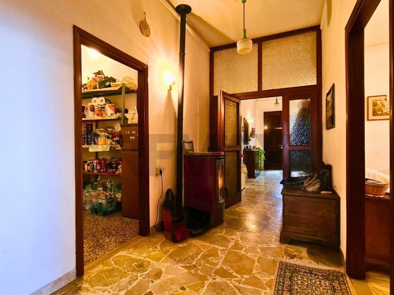 Al primo piano di circa 150 mq. con accesso da scala esterna e panoramica terrazza troviamo l'appartamento principale con ampio ingresso a corridoio, 1 cucina con focolare e balcone, 1 salone, 3 camere, 1 ripostiglio e 1 bagno e locale lavanderia.