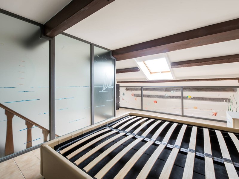 Una casa di grande fascino movimentata su due livelli con ingresso in grande sala con ampie e luminosissime finestre, da un lato il grande bagno con vasca idromassaggio e doccia, la cucina abitabile di buone dimensioni, dal lato opposto la camera da letto matrimoniale e al centro della sala la bellissima scala in legno, molto comoda con ampi scalini che conduce al piano superiore in cui troviamo la seconda camera da letto, un bagno in camera e un disimpegno molto caratteristico che può essere utilizzato ad esempio come cabina armadi.