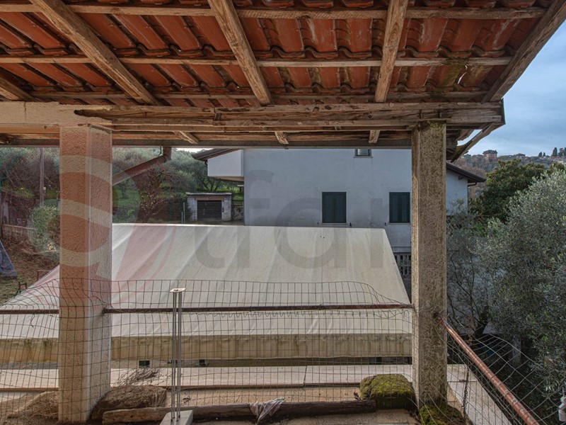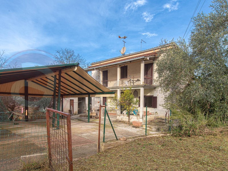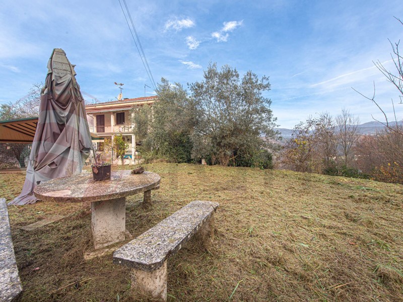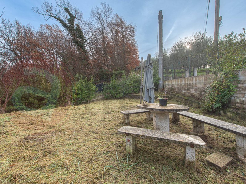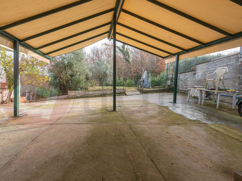 Il giardino intorno alla Villa è recintato, una volta superato il cancello automatico, tramite il comodo vialetto in cemento, si può accedere alle due aree di parcheggio, una coperta con tettoia in legno e l'altra scoperta, adiacente l'ingresso.
