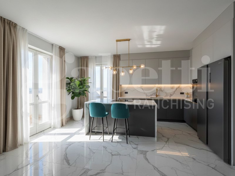 - la zona giorno, al quattordicesimo piano, ha un salone triplo con balconata vista Monte Maddalena, ampia cucina abitabile con balcone, bagno zona giorno e bagno ospiti, 2 camere matrimoniali e cabina armadio;