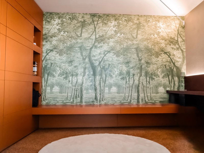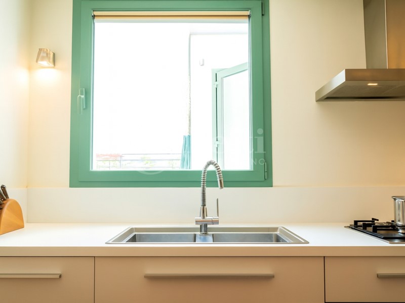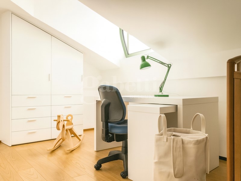 Il primo piano ospita due camere da letto, di cui la padronale dotata di bagno privato con vasca. Entrambe le stanze sono arredate con mobili su misura di alta qualità, pensati per coniugare estetica e funzionalità.