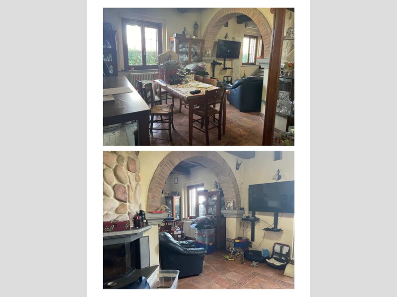 Porzione di fabbricato abitativo, di civile abitazione, con autorimessa, zona giorno al piano terreno formata da ampio soggiorno, vano cucina, entrambi con caminetto, bagno e locale ad uso ripostiglio; zona notte al piano primo, formata da n. 3 camere e n. 2 bagni di cui uno a servizio esclusivo della camera matrimoniale. Il fabbricato è dotato di resede esclusivo che si sviluppa principalmente nella zona antistante l'ingresso.