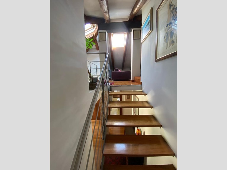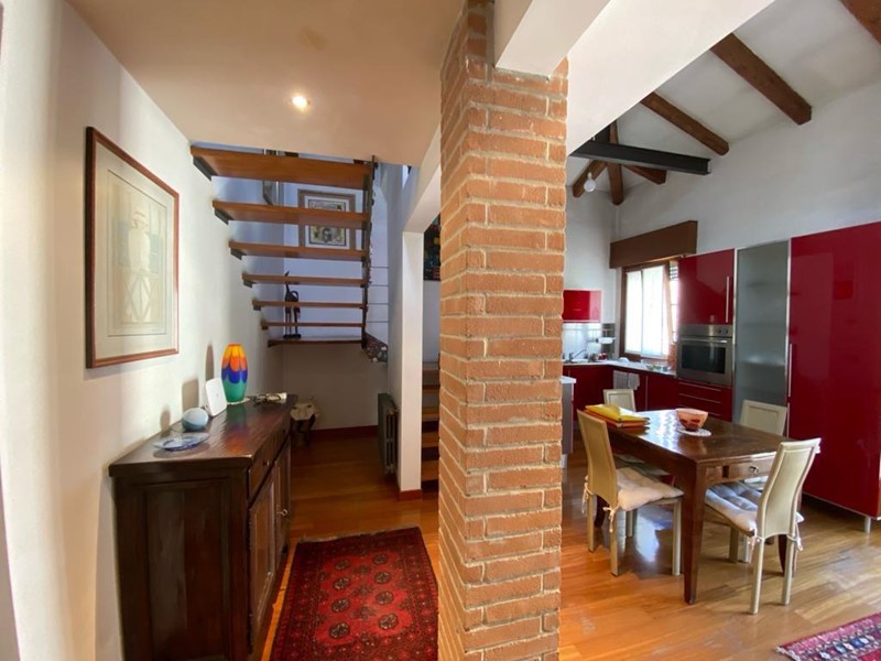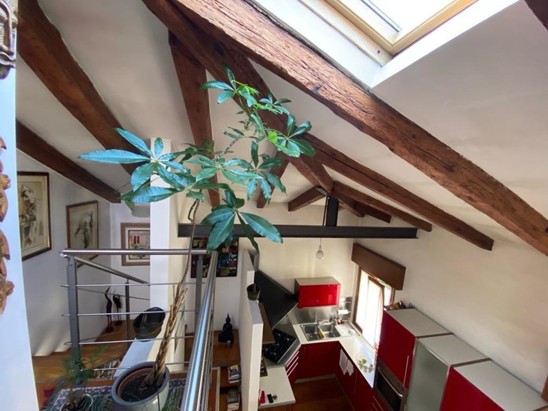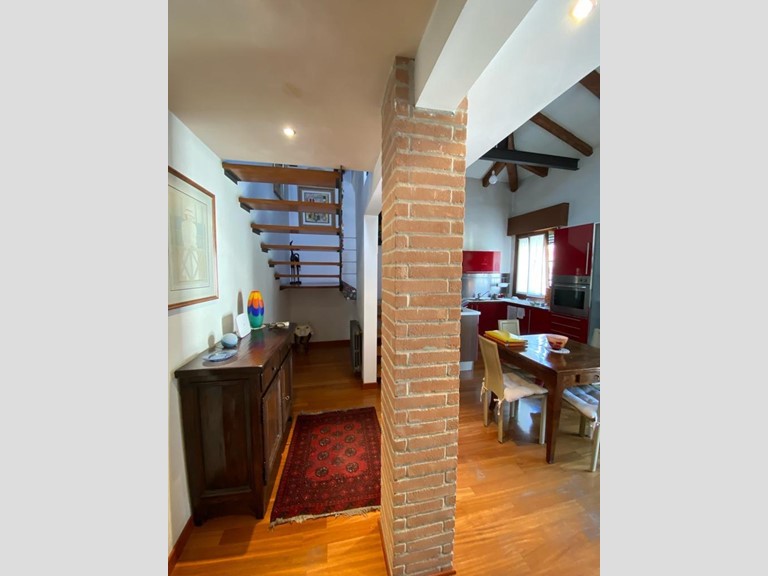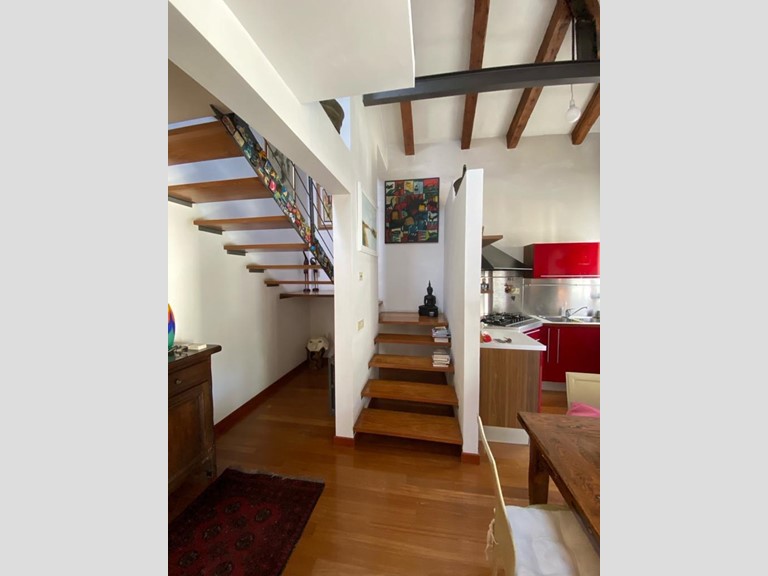 L'immobile si apre su un accogliente ingresso che conduce alla sala da pranzo con cucina a vista, dotata di un terrazzino. Una moderna scala in legno porta a un soppalco praticabile, attualmente adibito a soggiorno, con travi a vista che conferiscono un tocco di charme all'ambiente.