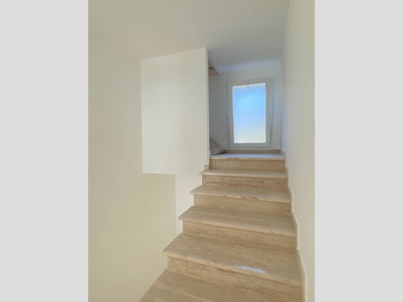 Il piano primo, di circa 70 m², collegato da una elegante scala interna in travertino, ospita tre camere da letto, di cui una matrimoniale con bagno en suite, due camere singole, un bagno principale e una terrazza panoramica con vista mare, oltre a balconi per una superficie complessiva di circa 55 m², veri e propri spazi da vivere allaperto.