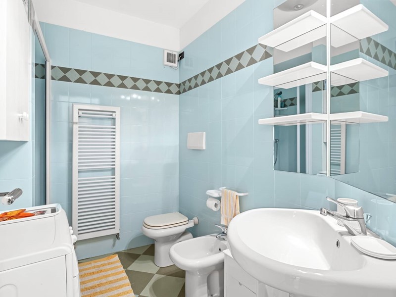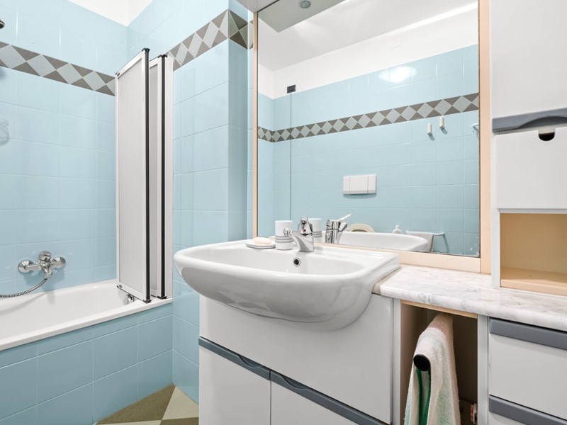 La zona giorno gode di una piacevole vista laterale sul mare, mentre le camere da letto sono ampie e silenziose. Sono presenti due bagni, uno con vasca e uno con doccia, una cucina separata di generose dimensioni con dispensa e un locale guardaroba. Un balcone con affaccio sul verde introduce un elemento di tranquillità che bilancia la vivacità della passeggiata.