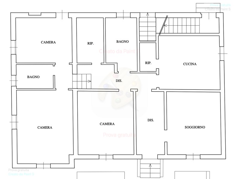 Piano Primo: appartamento composto da: ingresso, soggiorno, sala da pranzo, cucinotto, 4 camere da letto matrimoniali, 2 bagni e balcone.
