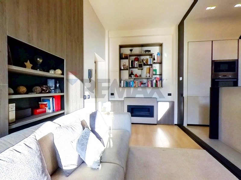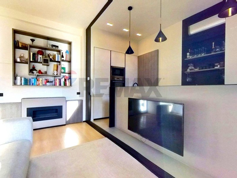 soggiorno comodo e funzionale con cucina a vista, fornelli ad induzione, attrezzata di isola a dividere i due ambienti, presente un caminetto e un balconcino con affaccio interno.