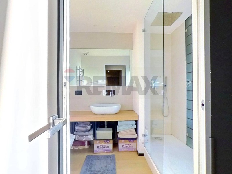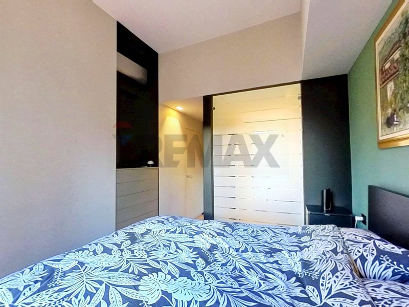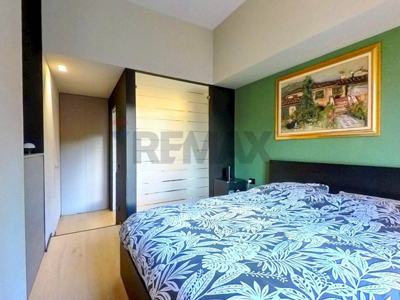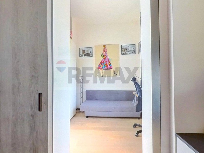 Tramite le porte scorrevoli presenti nella zona giorno si accede da una parte alla cameretta dotata di ripostiglio in quota e dall'altra al disimpegno dove troviamo il primo bagno non finestrato con doccia, proseguendo si accede alla camera matrimoniale dotata di bagno en - suite con box doccia.