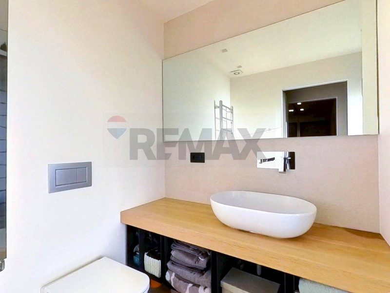 L'immobile presenta infissi in doppio vetro, tapparelle elettriche e zanzariere, aria condizionata in soggiorno e nelle due camere, riscaldamento autonomo a pavimento.