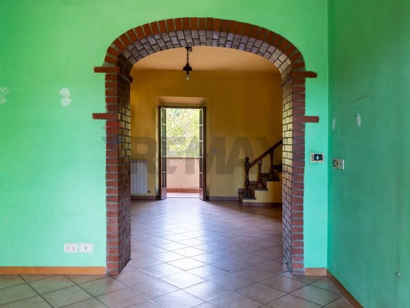 L'appartamento con ingresso indipendente si distribuisce al piano primo di un agglomerato di abitazioni ed è così composto: entrando troviamo le scale, che portano al grande soggiorno dove è presente un bellissimo camino ed una terrazza; alla sinistra un incantevole arco in mattoni, che unisce l'ambiente alla cucina abitabile dove è presente un'altro balcone con una splendida vista tipica delle campagne toscane.