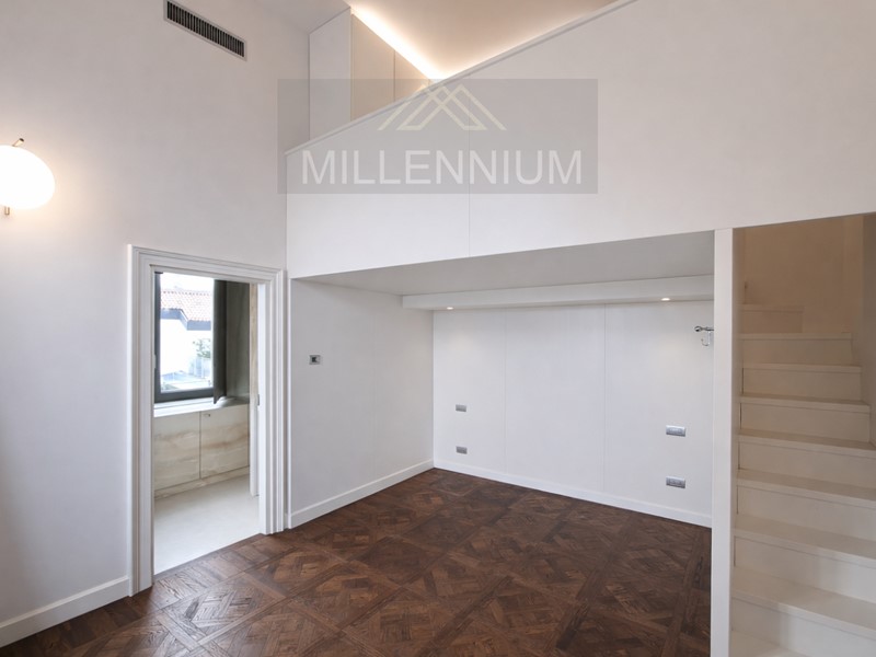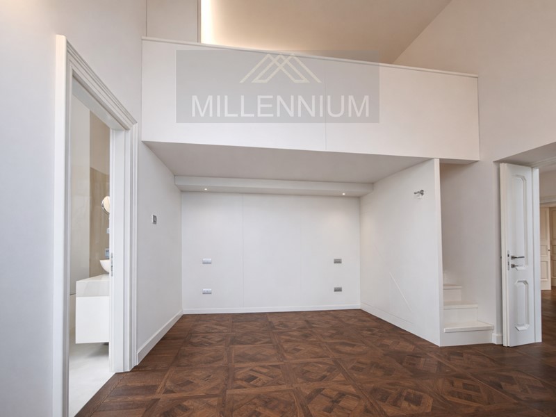 Ingresso, Sala di ampia metratura (progettata inizialmente con cucina a vista), cucina semiabitabile, camera matrimoniale soppalcata con bagno privato, cameretta e altri 2 servizi. Armadi su misure, porte Stile Liberty.