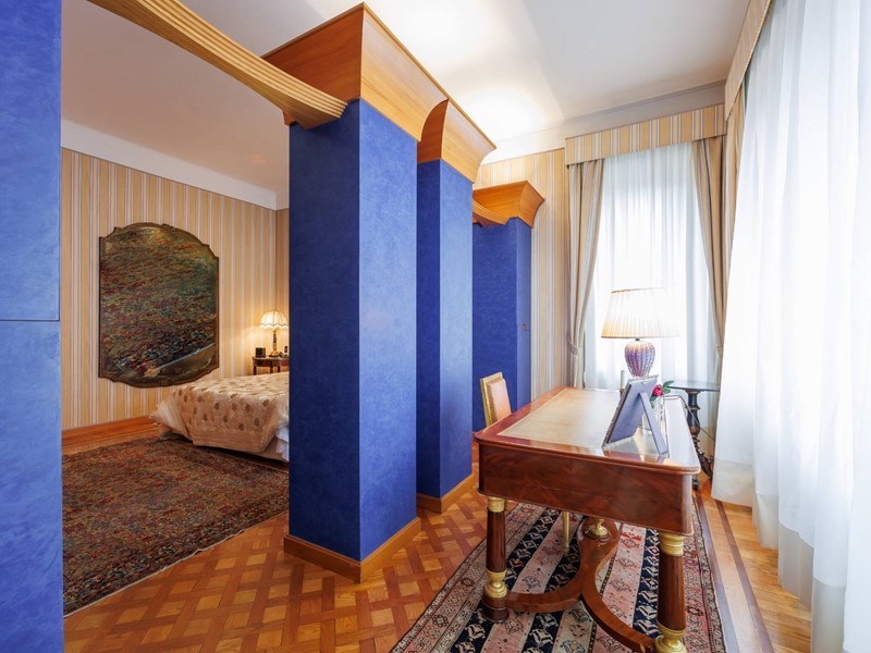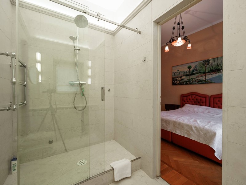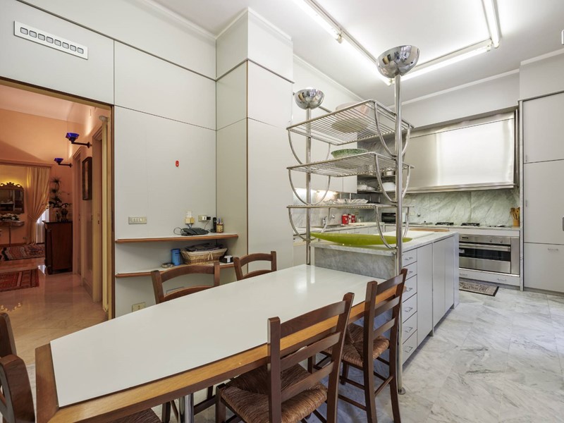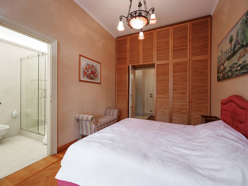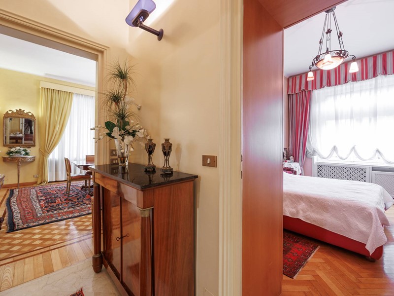 L'immobile, di ampia metratura, si divide in due grandi zone; a destra dell'ingresso ci si immerge in una prestigiosa zona giorno rappresentata da doppio salone con sala da pranzo che affaccia su via Cantore tramite un fruibile terrazzo, una prima camera con bagno privato all'interno, un bagno di servizio, cucina abitabile con un piccolo terrazzo sull'interno cortile ed infine un corridoio dotato di armadiatura che collega la seconda zona dell'appartamento.