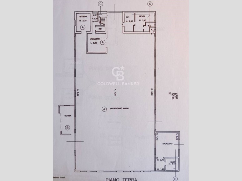 Il capannone, con unaltezza interna media di 8 metri, si sviluppa su due livelli ed ha una copertura in eternit.