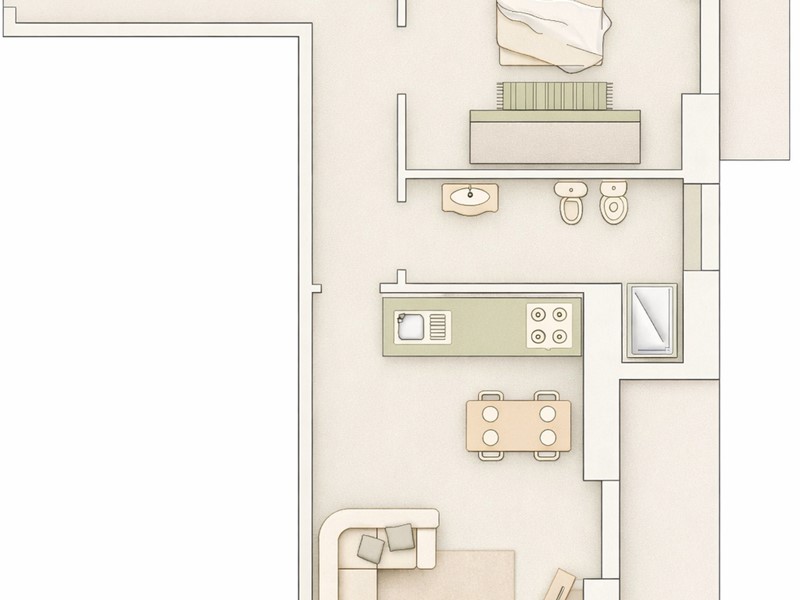 La soluzione è composta da ingresso, ripostiglio, soggiorno con angolo cottura, camera matrimoniale, bagno, due balconi e parcheggio condominiale. L’unità dispone di riscaldamento autonomo con split caldo/freddo e boiler elettrico, mentre le spese condominiali ammontano a circa 450 € l’anno.