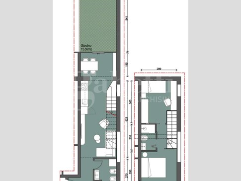 L'appartamento si sviluppa su due livelli ed è composto da ingresso sull'ampia sala con cucina a vista , con accesso al giardino e il primo bagno.