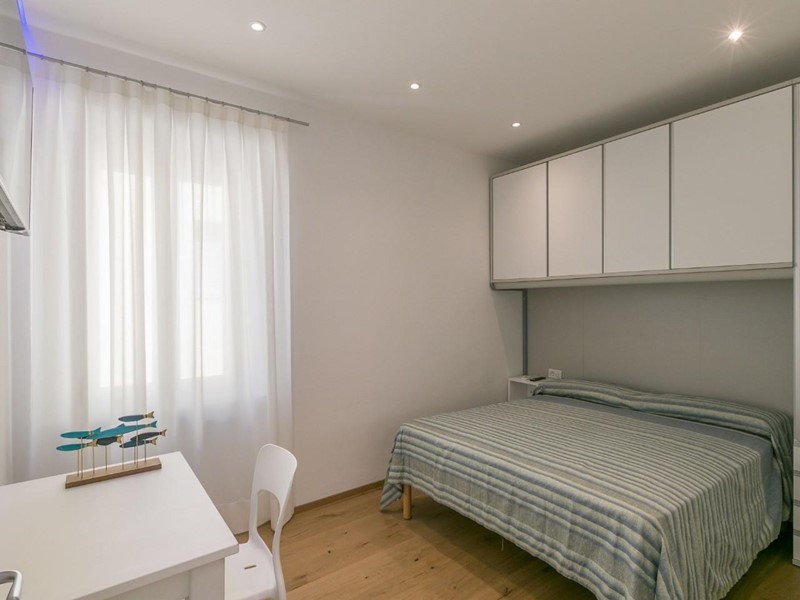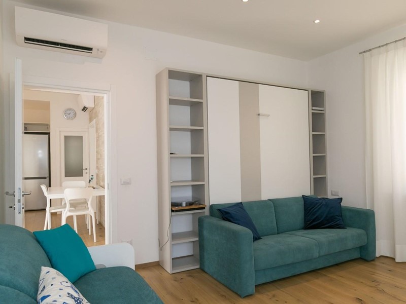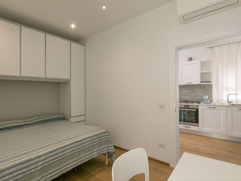 Situato al primo piano, l'appartamento offre spazi ben distribuiti e luminosi. La zona giorno è composta da una cucina funzionale e un soggiorno confortevole, arricchito da un piccolo balcone e un pratico letto matrimoniale a scomparsa, integrato nell'armadio.