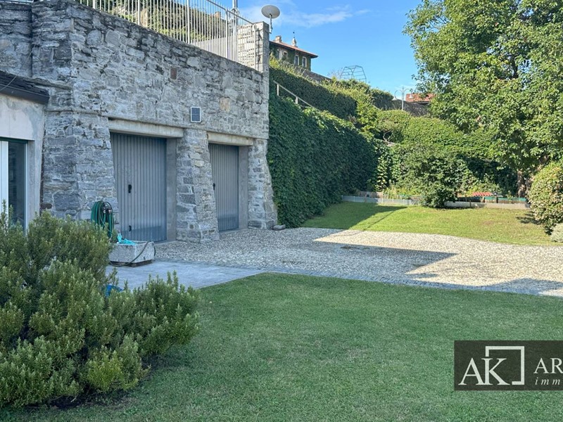 Completano la proprietà un giardino con vista lago di circa 2.100 mq e due autorimesse.