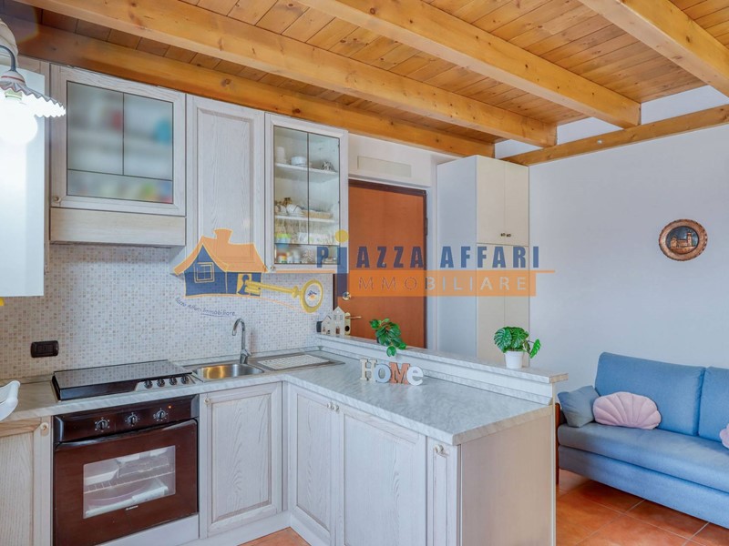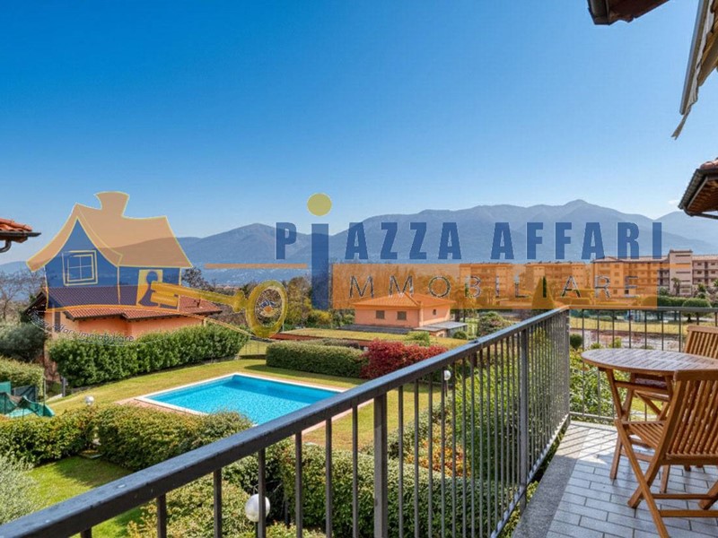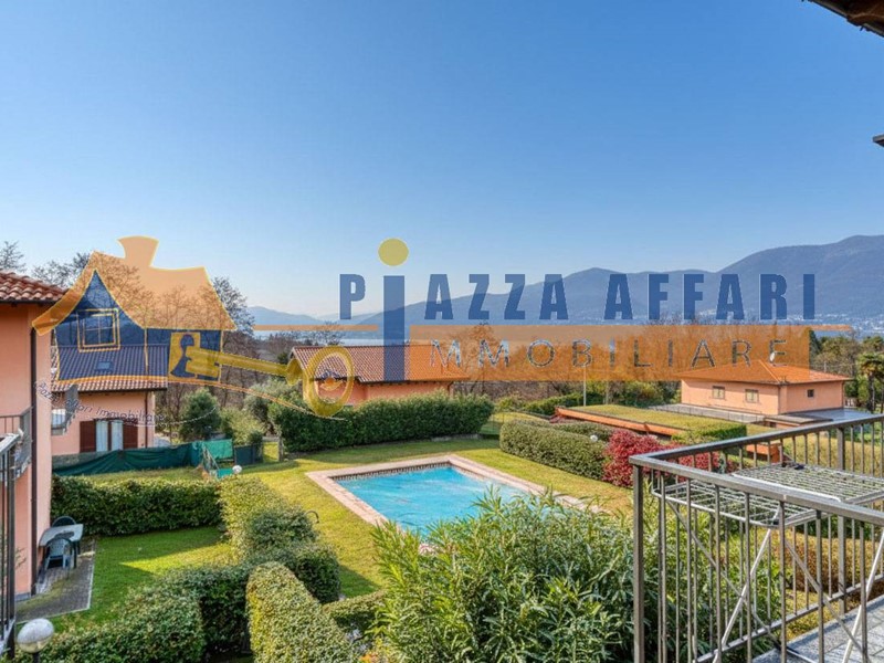 Lingresso si apre direttamente sul soggiorno con cucina a vista, ambiente luminoso e accogliente, dal quale si accede al balcone principale dal quale si gode di una splendida vista panoramica sul Lago Maggiore e sulla catena del Monte Rosa, oltre a un gradevole affaccio sulla piscina.