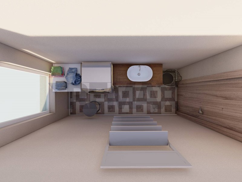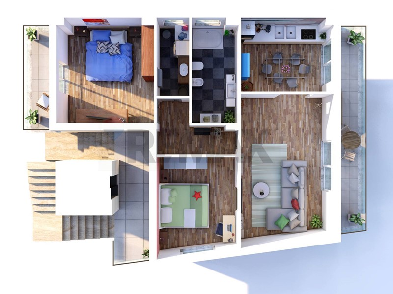L'appartamento al piano terra rialzato ha l'accesso carrabile indipendente che porta ad un terrazzo privato utilizzabile sia come parcheggio che come area esterna attrezzata per l'estate. Gli interni del piano terra comprendono un ampio soggiorno con angolo cottura, tre camere da letto, un bagno principale e una lavanderia con doppio servizio.