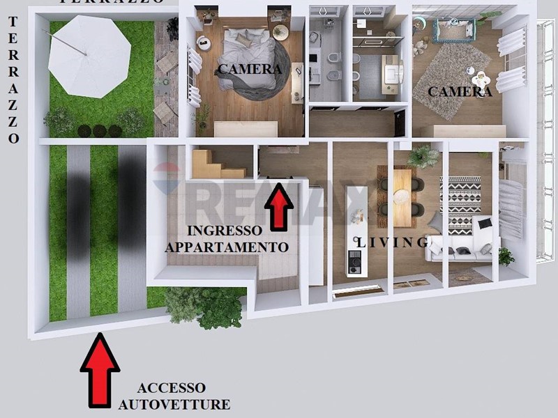 L'appartamento al piano terra rialzato ha l'accesso carrabile indipendente che porta ad un terrazzo privato utilizzabile sia come parcheggio che come area esterna attrezzata per l'estate. Gli interni del piano terra comprendono un ampio soggiorno con angolo cottura, tre camere da letto, un bagno principale e una lavanderia con doppio servizio, inoltre l'appartamento gode di doppia esposizione; l'immobile è dotato di impianto autonomo di riscaldamento e raffrescamento tramite fancoil, cappotto termoisolante, infissi a taglio termico di ultima generazione, pannelli fotovoltaici.