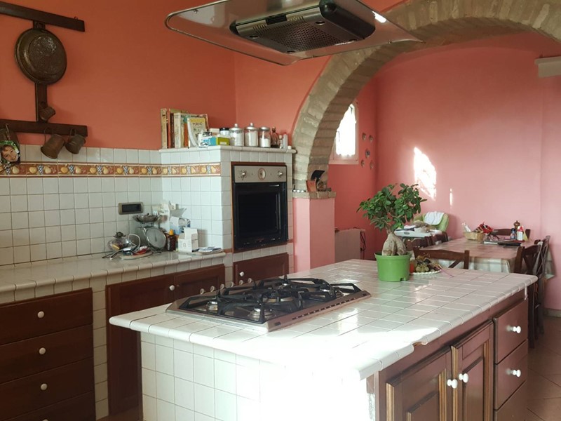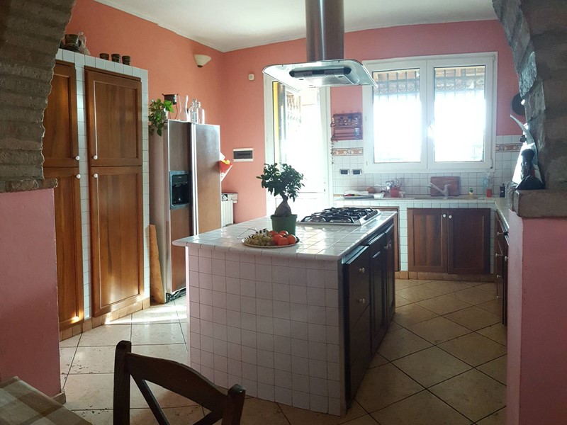 Lingresso principale al piano terra conduce a un salone doppio con zona pranzo e area soggiorno dotata di camino e ampia vetrata. La spaziosa cucina in muratura, in stile arte povera, è impreziosita da unisola centrale con piano cottura. Sempre al piano terra sono presenti un bagno, una lavanderia e laccesso al grande garage.