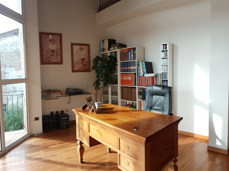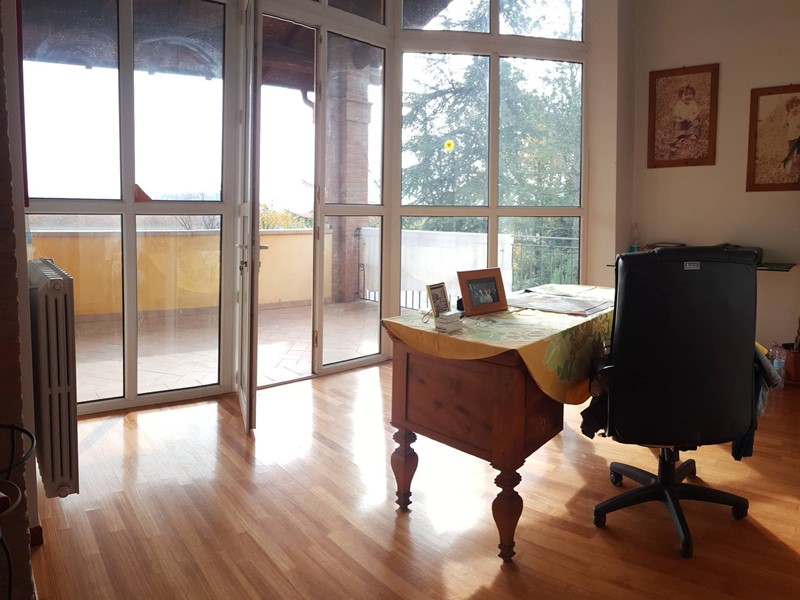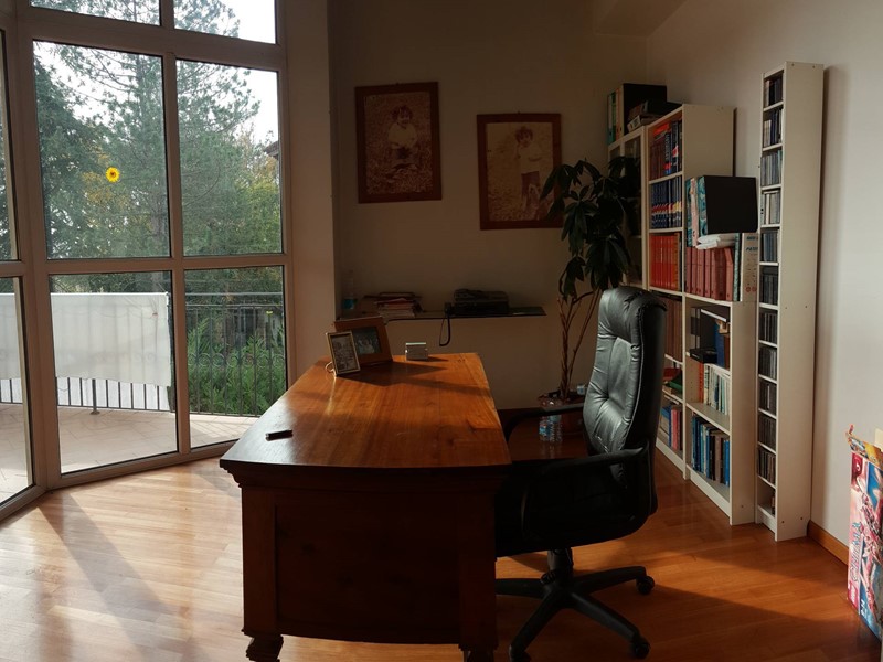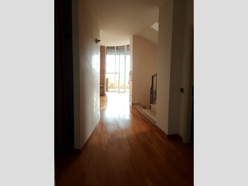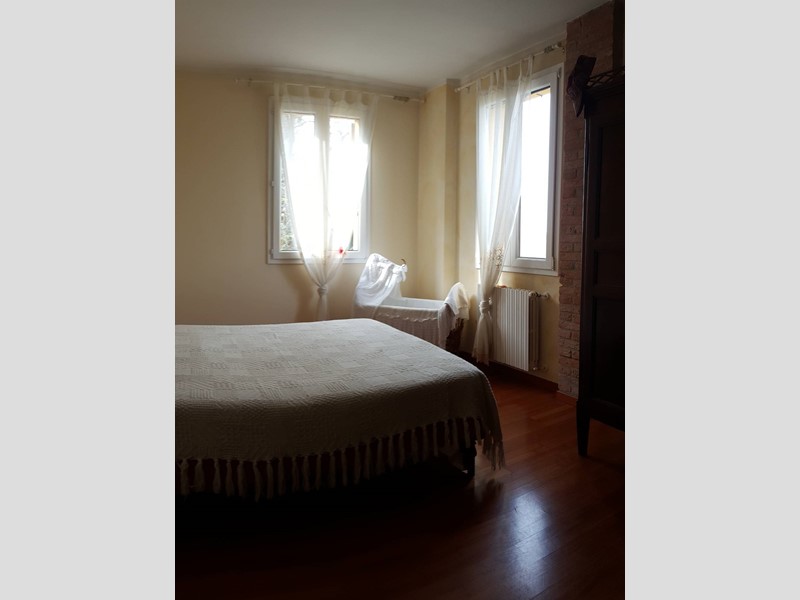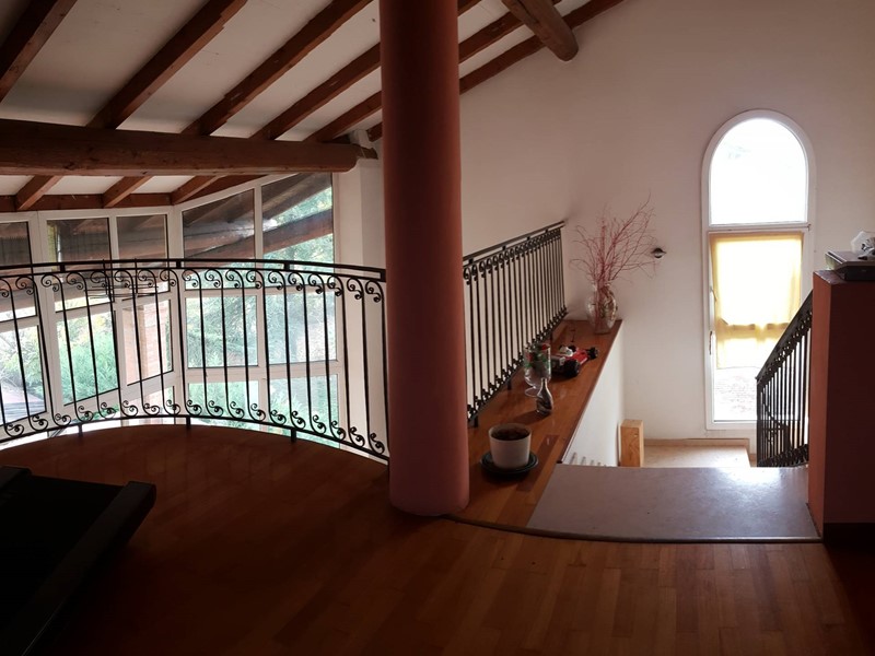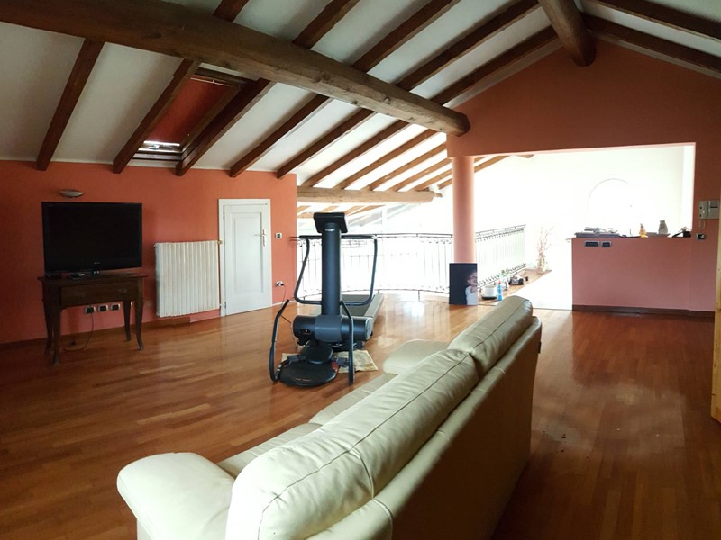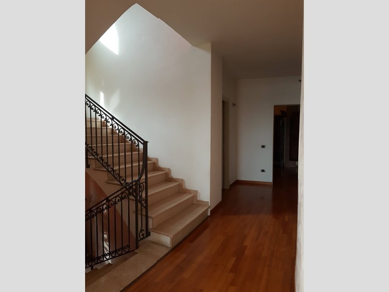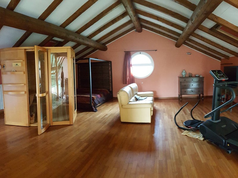 Il piano superiore, collegato internamente tramite una comoda scala in muratura, ospita la zona notte con quattro camere matrimoniali, due bagni e una zona studio caratterizzata da unampia vetrata con terrazza. Allultimo livello si trova una suggestiva mansarda con bagno.