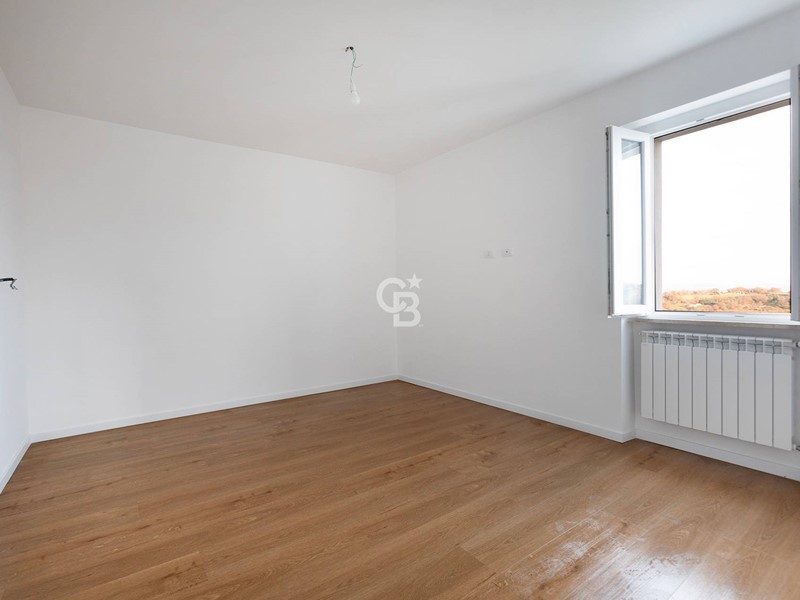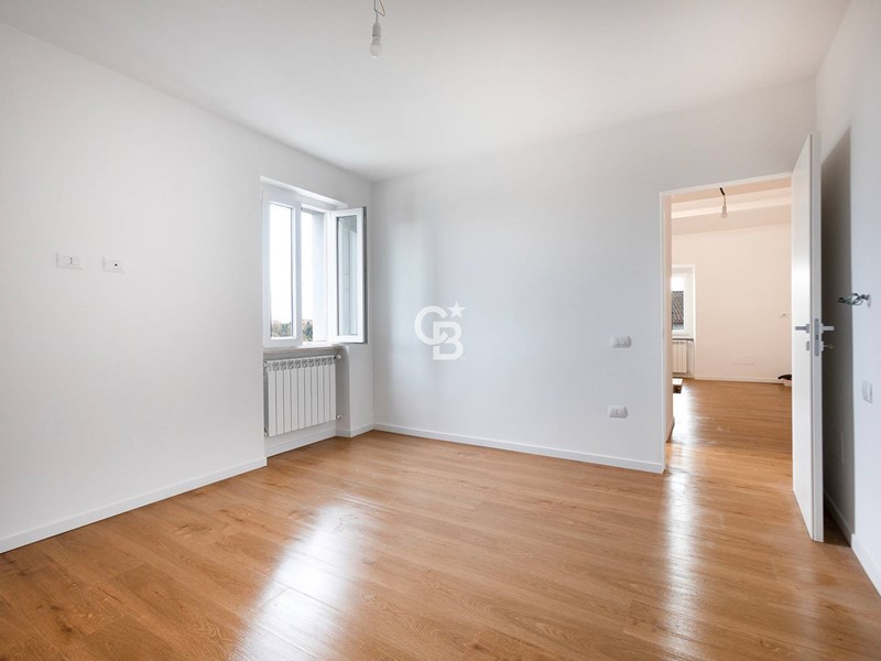 L'ingresso si apre su un soggiorno spazioso con angolo cottura, un ambiente fluido inondato di luce naturale. Sullo stesso livello troviamo la prima camera matrimoniale con vista panoramica sulla Valle del Tevere e un bagno finestrato elegantemente rifinito, completo di doccia.
